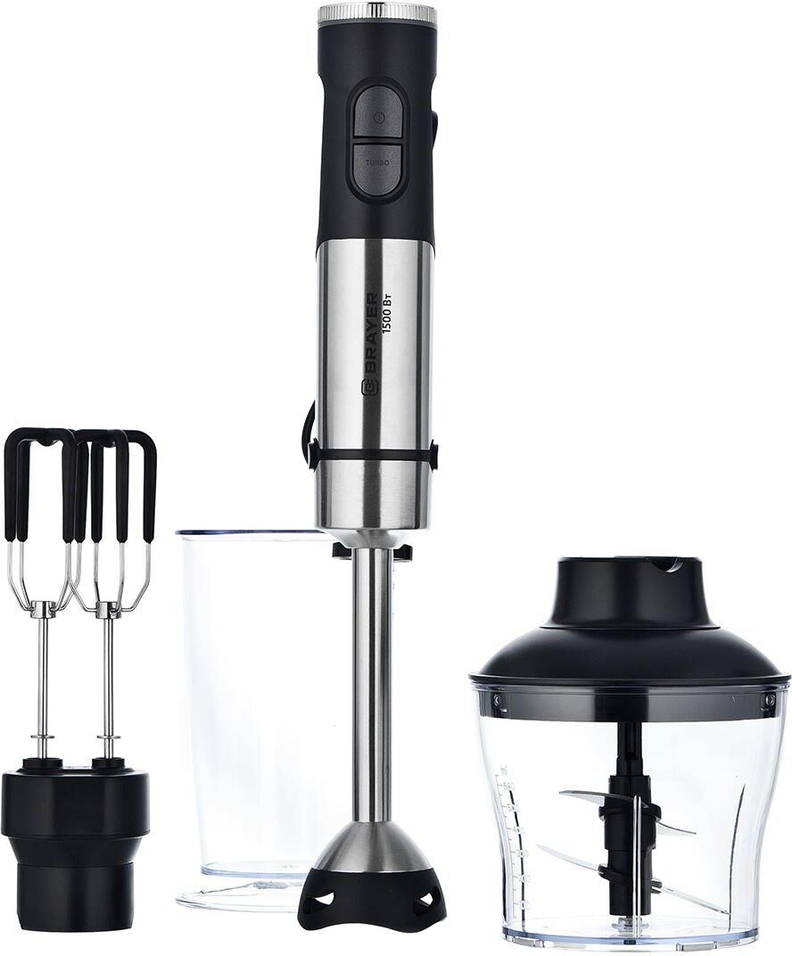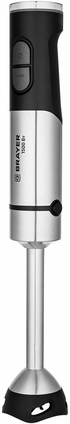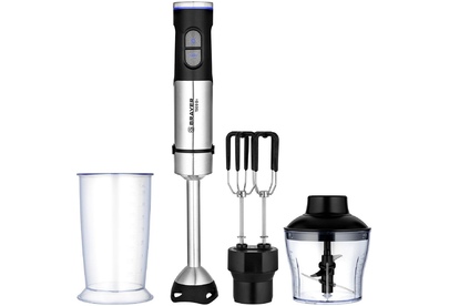 Мощность 1500 Вт Лезвия из титана Погружная часть блендера с нейлоновым покрытием для предотвращения повреждения посуды Корпус из пластика, декорирован нержавеющей сталью Плавная регулировка скорости Насадка-миксер для взбивания с нейлоновым покрытием для предотвращения повреждения посуды Стакан для смешивания 800 мл Насадка-блендер для измельчения и смешивания Насадка-измельчитель объемом 600 мл Электропитание 220-240 В, ~ 50-60 Гц