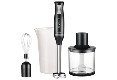 Блендер погружной, максимальная мощность 900 Вт, импульсный режим работы, 2 скорости, насадка-блендер из нержавеющей стали, съемная насадка-венчик из нержавеющей стали, мини-измельчитель 500 мл, мерный стакан 700 мл, цвет черный с серым