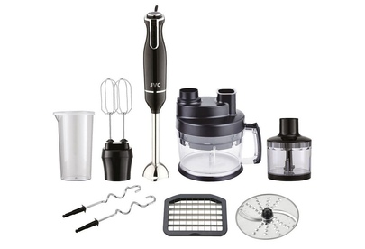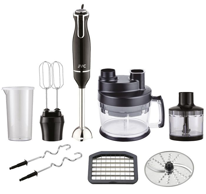 Многофункциональный блендер, максимальная мощность: 1400 Вт, регулятор переменной скорости, Турбо режим, погружная часть блендера из нержавеющей стали, лезвия блендера из нержавеющей стали: 4 лепестка, контейнер для нарезки кубиками объемом: 2 л, размер сетки для нарезки кубиками: 8х8 mm, измельчитель емкостью: 400 мл, реверсивный диск для нарезки и измельчения, насадка двойные битеры, насадка двойные крючки, мерный стакан с крышкой: 600 мл, эргономичная ручка, петля для подвешивания, простота в использовании и чистке