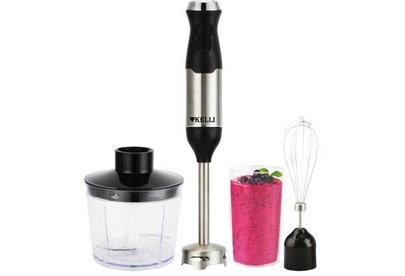 Блендер Мощность: 1500Вт Мерный стакан: 700мл Чаша измельчителя : 500 мл Число скоростей: 2 Плавный регулятор мощности Удобная эргономичная ручка Ножи из нержавеющей стали Металлическая погружная часть Венчик для взбивания 220-240 В, 50\ Гц Размеры: 24см*24,5см*16,6см