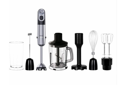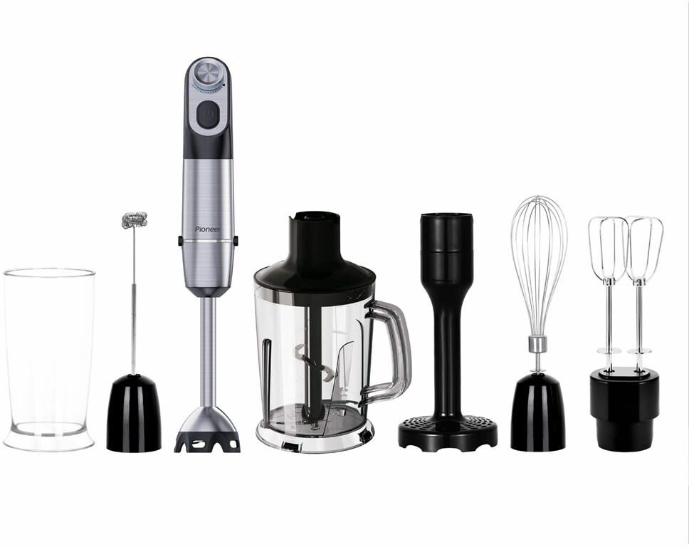Блендер погружной, набор - 7 предметов, мощность 1800 ватт, специальный регулировочный "шатл" со светодиодной подсветкой и плавной регулировкой скорости, до 10 режимов, цельнометаллическая ножа блендера, 4-х лепестковый S-образный стальной нож, S- образный нож измельчителя, измельчитель с крышкой - 500 мл, мерный стакан с крышкой - 600 мл, насадка - венчик, насадка - миксер( биттеры) насадка для вспенивания молока, насадка для приготовления пюре со стальным ножом, защита двигателя от перегрузок, защита двигателя от перегрева, хромированные вставки на корпусе, цвет корпуса - черный