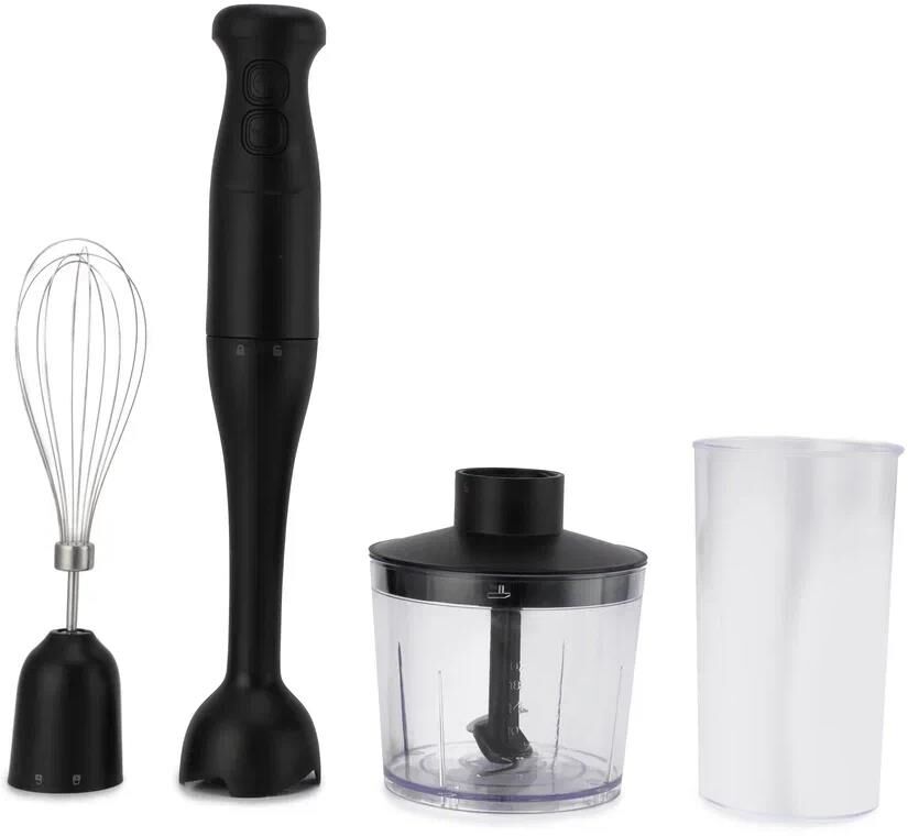 Погружной блендер 3в1 позволит готовить вкусные и разнообразные блюда. В комплект входят: насадка-измельчитель, чаша для измельчения объемом 0.5 л, венчик для взбивания, а также мерный стакан объемом 0.7 л для смешивания продуктов. Имеет 1 скорость работы. Позволяет размельчить мясо и овощи, взбивать жидкие ингредиенты до однородной массы, а также готовить супы, пюре, смузи и детское питание. С помощью венчика и функции ручного миксера легко сделать тесто для блинчиков, соусы, кремы и молочные коктейли. Для стационарного варианта лучше воспользоваться емкостью с острым ножом, который справиться с продуктами разной твердости. Чаша и корпус электрической мешалки изготовлены из прочного пищевого пластика, безопасного для здоровья.