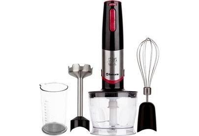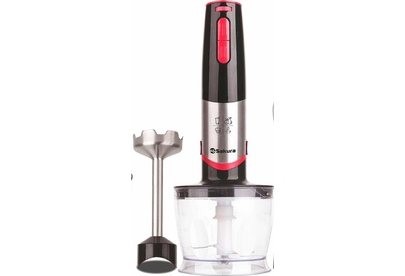 мощный и тихий DC мотор, 2 скорости работы — дополнительная регулировка, острые лезвия из нержавеющей стали, погружная часть блендера из нержавеющей стали, венчик из нержавеющей стали; 3 насадки (блендер, венчик, чоппер 0,5 л), стакан (0,5 л)
