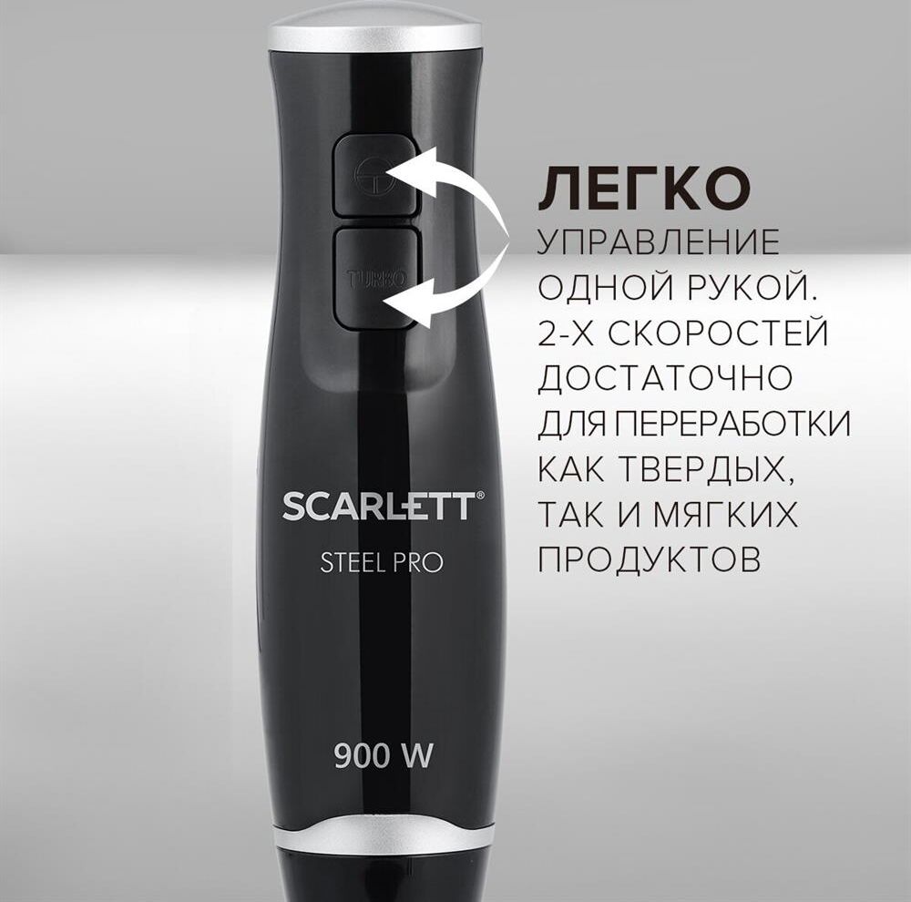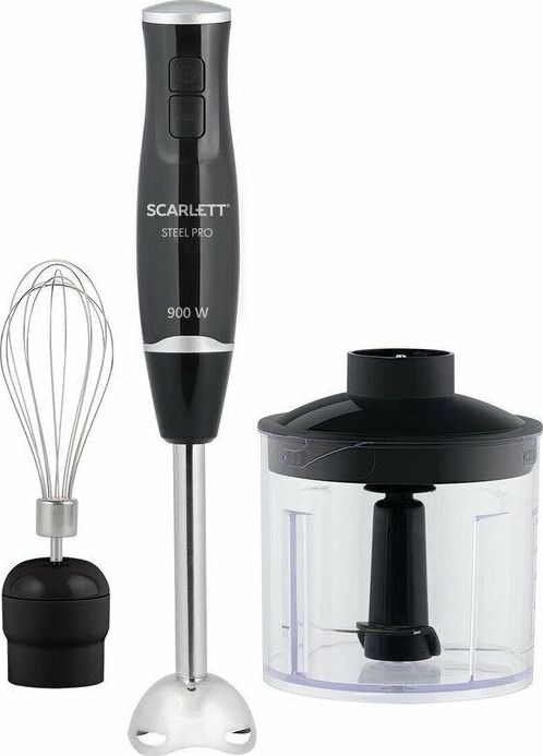 Тип: Погружной Мощность, Вт: 900 Количество скоростных режимов: 2 Режим TURBO: Да Защита от перегрузки: Да Емкость мини-измельчителя, л: 0.5 Насадка-блендер: Да Материал погружной части насадки-блендера: Нержавеющая сталь STEEL PRO Мойка в посудомоечной машине: Венчик (металлическая часть), мини-измельчитель без крышки Материал корпуса: Пластик Длина электрошнура, м: 1 Цвет: Черный. Scarlett SC-HB42F08 – современный погружной блендер 3в1 предназначен для измельчения, взбивания и смешивания продуктов. Погружная часть блендера изготовлена из нержавеющей стали марки Steel Pro, которая отлично подходит для приготовления блюд любой температуры. Блендер станет незаменимым помощником на кухне, ведь он имеет 2 скоростных режима, включая турбо режим, что позволит справиться с кулинарными задачами любой сложности. В комплект блендера включены: насадка для измельчения и смешивания, мини-измельчитель, объём которого составляет 500 мл, а также металлический венчик для взбивания.