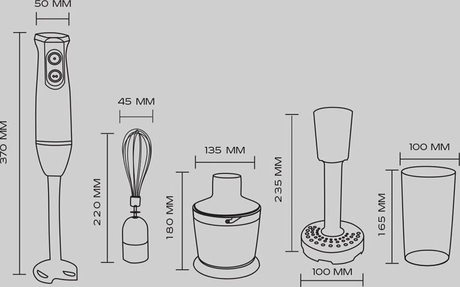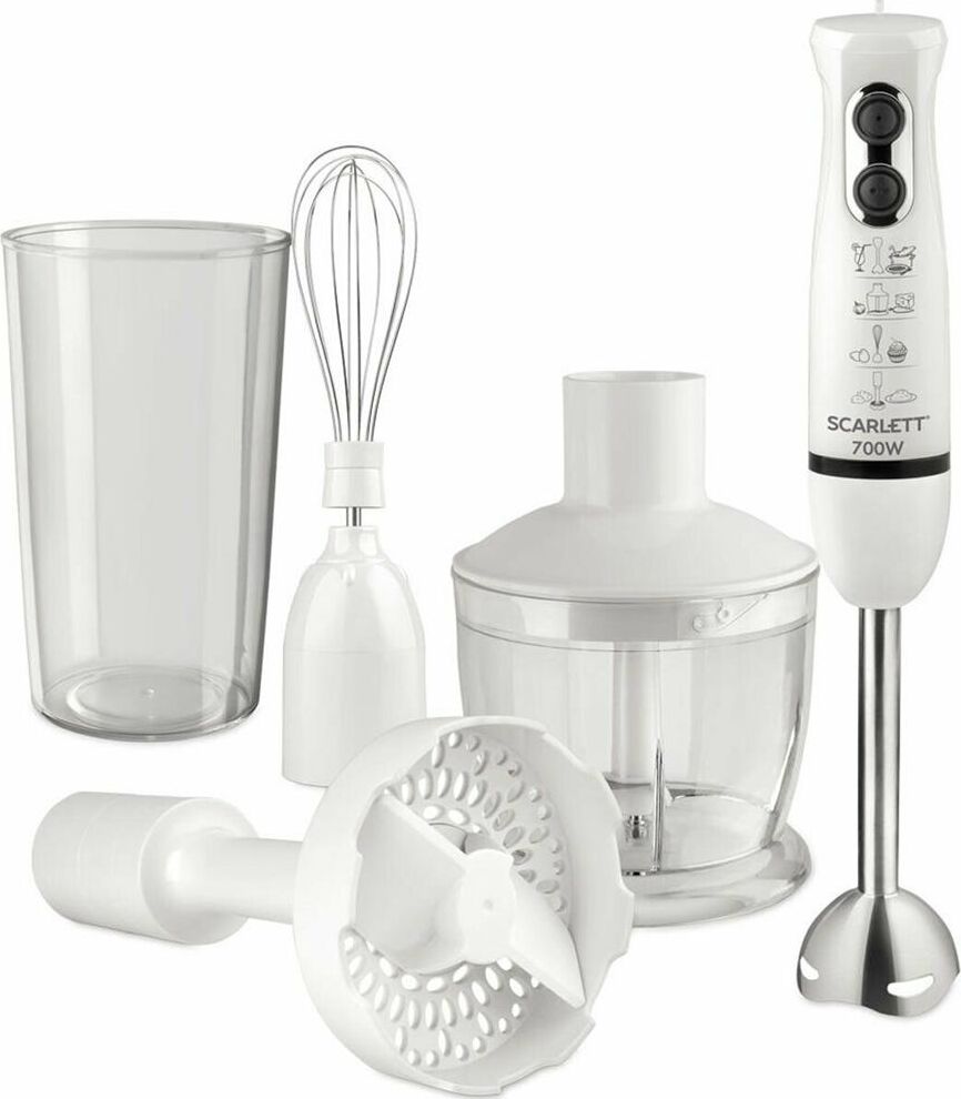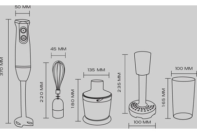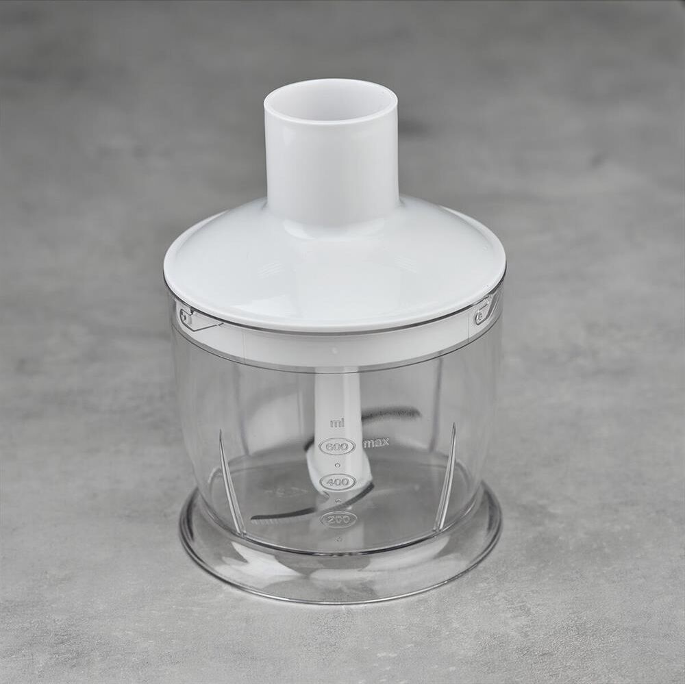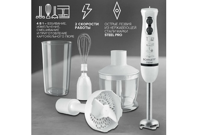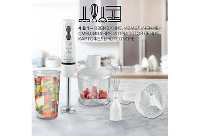 Максимальная мощность 700 Вт, 4 в 1: подходит для измельчения, взбивания, смешивания, приготовления картофельного пюре, Измельчитель 0.6л Насадка блендер из нержавеющей стали «Steel Pro», Венчик для взбивания Насадка для картофельного пюре - специальная насадка с двумя широкими лопастями приготовит идеальное воздушное пюре без комочков, Мерный стакан 0.6л