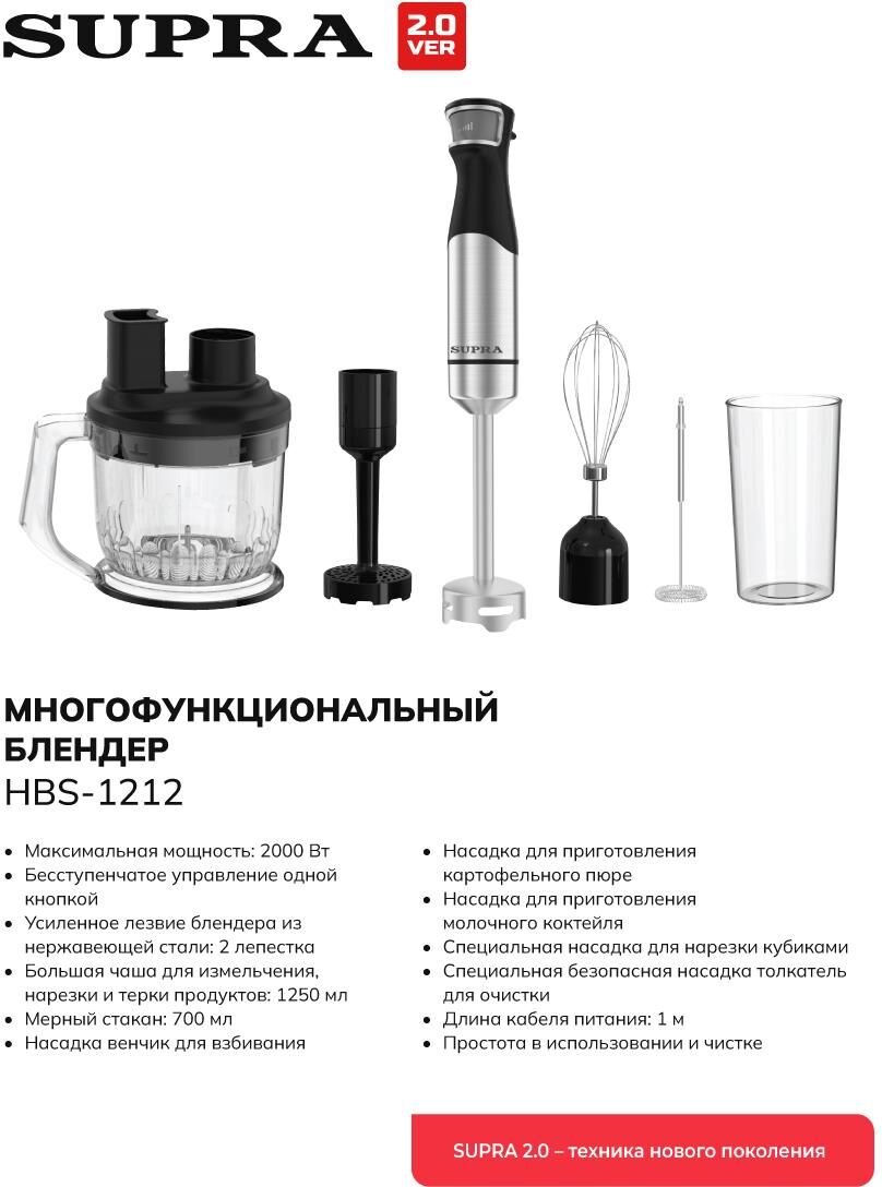 Многофункциональный блендер( набор - кубик), максимальная мощность: 2000 Вт, бесступенчатое управление одной кнопкой, усиленное лезвие блендера из нержавеющей стали: 2 лепестка, большая чаша для измельчения, нарезки и терки продуктов: 1250 мл, мерный стакан: 700 мл, насадка венчик для взбивания , насадка для приготовления картофельного пюре, насадка для приготовления молочного коктейля, специальная насадка для нарезки кубиками, специальная безопасная насадка толкатель для очистки, длина кабеля питания: 1 м.
