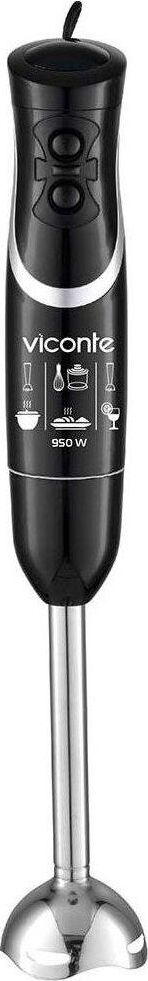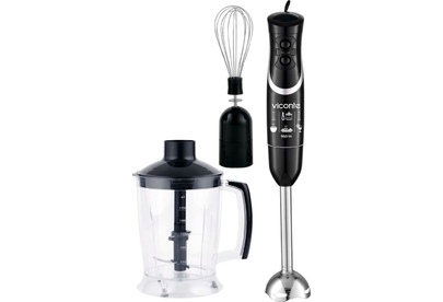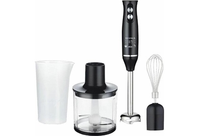 Погружной блендер, мощность 950W, пульсовый режим работы, 2 скорости, металлическая нога блендера, венчик для взбивания, чаша объемом 1250 мл с ножом из 4 лезвий для рубки и измельчения, автоматическая блокировка при неправильно установленной насадке.