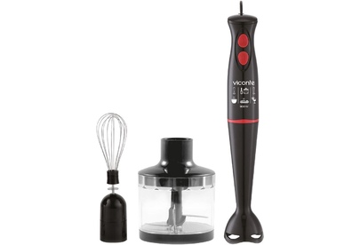 Погружной блендер Viconte VC-4448 900 W, Погружной блендер, мощность 900 W, современный эргономичный дизайн, пульсовый режим работы, 2 скорости, лезвия из нержавеющей стали, пластиковая нога блендера, венчик для взбивания, чаша с ножом для рубки и измельчения, 500 мл; автоматическая блокировка при неправильно установленной насадке, удобство и простота в обращении и чистке.