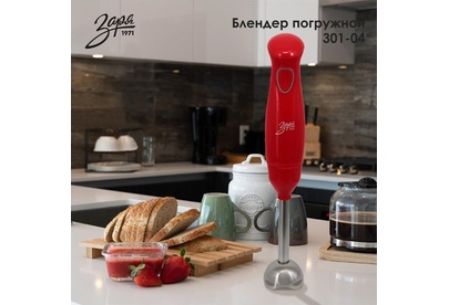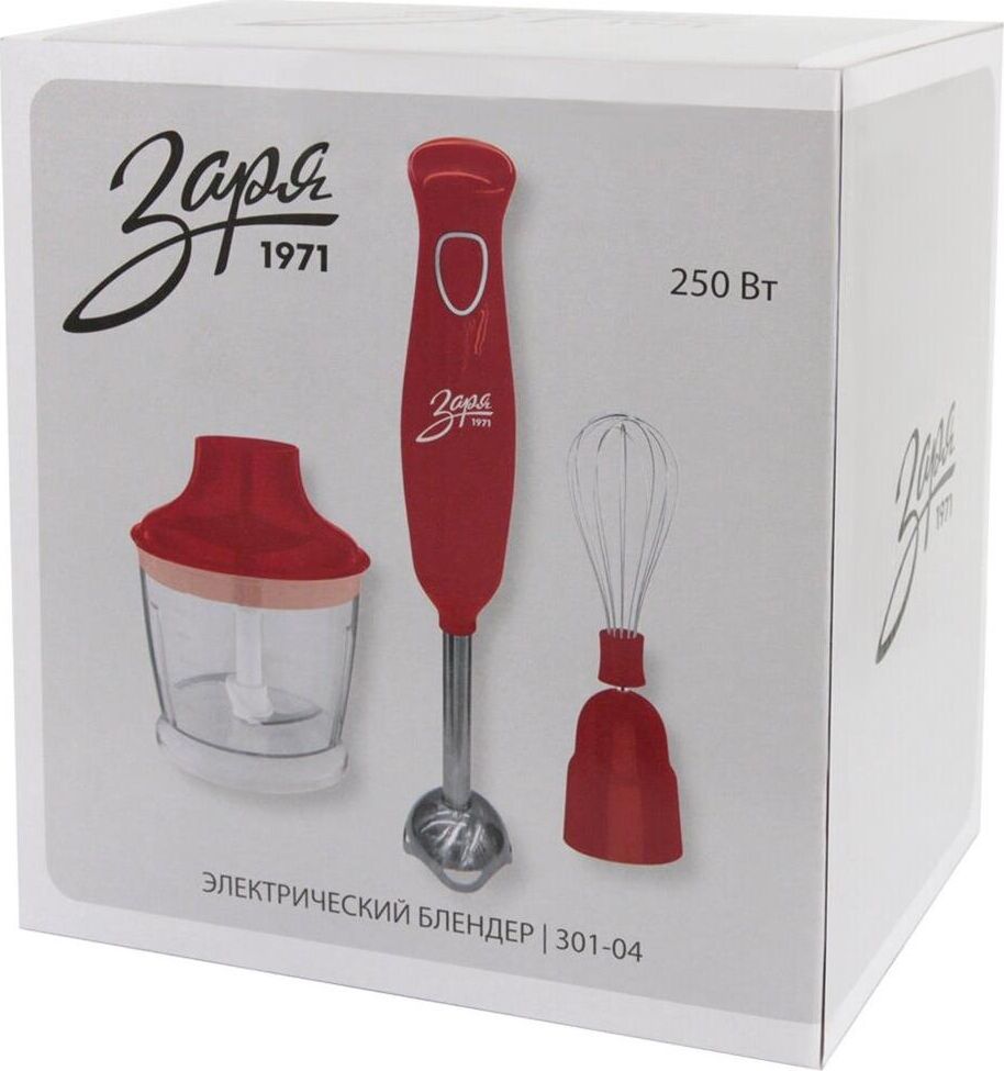 ЗАРЯ 301-04 Мощность 250 Вт, чаша-измельчитель (500 мл), насадка венчик, насадка блендер из нержавеющей стали УДОБНО Конструкция с прямым приводом наиболее удобна и проста в использовании. Ручка блендера изготовлена с учетом анатомических особенностей руки человека. МОЩНОСТЬ Высоко оборотистые двигатели данной модели позволяют свести время работы до нескольких секунд и полностью соответствуют европейским нормам безопасности. ЛЕГКОСТЬ В РАБОТЕ Использование разборной конструкции блендера позволяет его быстро мыть и компактно хранить. ФУНЦИОНАЛЬНОСТЬ С помощью блендера можно быстро и качественно: измельчить орехи, травы, сыр, приготовить горячее пюре прямо в кастрюле (50°С), смешать коктейль или детское питание.