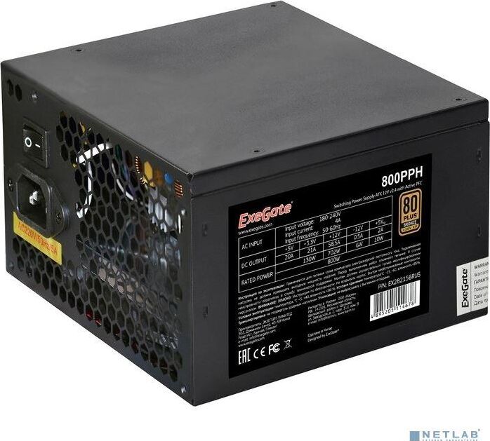 [Блок питания] Exegate EX282156RUS Блок питания 800W ExeGate 80 PLUS® Bronze 800PPH (ATX, APFC, КПД 89% (80 PLUS Bronze), 12cm fan, 20+4pin, 2x(4+4)pin, 4xPCI-E, 8xSATA, 4xIDE, black, Color Box)