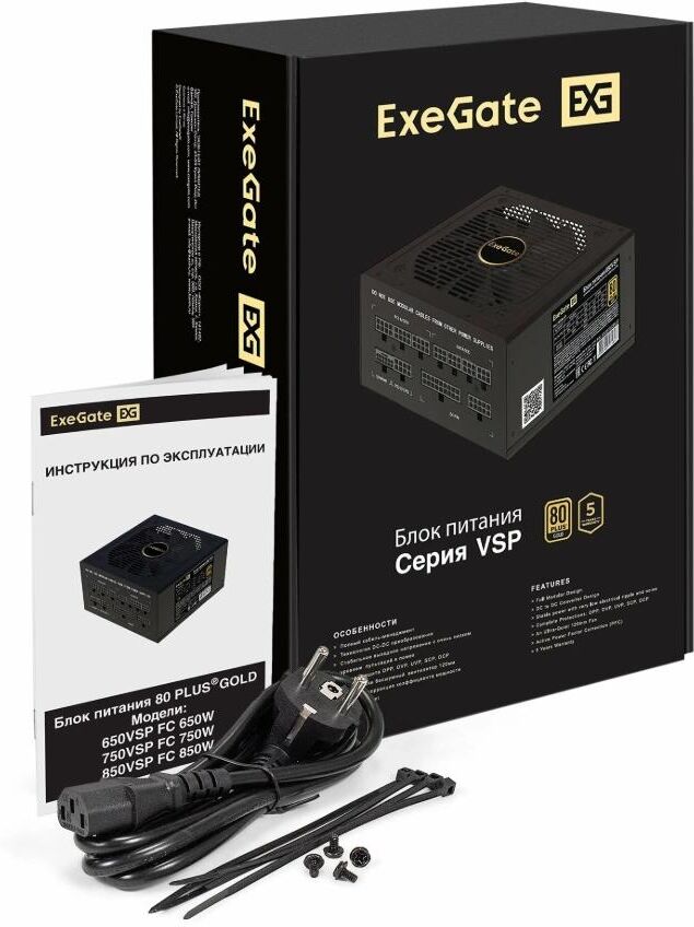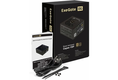 Блок питания 850W ExeGate 80 PLUS® GOLD 850VSP FС (ATX3.0, APFC, КПД 90% (80 PLUS Gold), 120мм fan, 24pin, 2x(4+4)pin, PCIE5.0/12VHPWR, 4xPCI-E, 6xSATA, 3xIDE, 1xFDD, Full Cable Management, black, Color box)