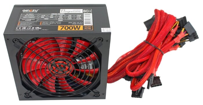 Блок питания GINZZU PC700 14CM(Red) 80+ black,APFC,24+4p,2 PCI-E(6+2), 7*SATA, 4*IDE,оплетка, кабель питания,цвет