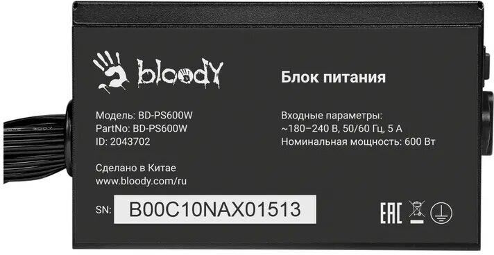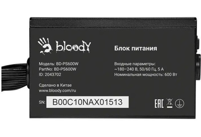 BLOODY Блок питания ATX 600W BD-PS600W 80 PLUS WHITE (20+4pin) APFC 120mm fan 6xSATA RTL