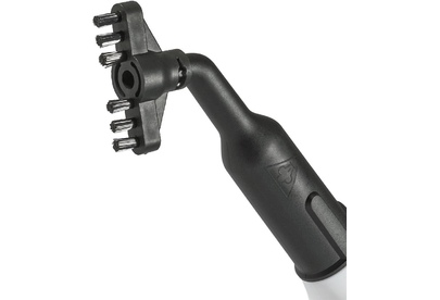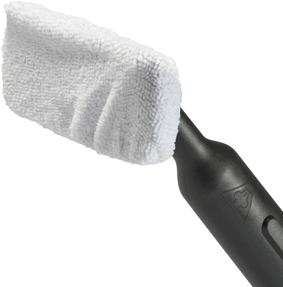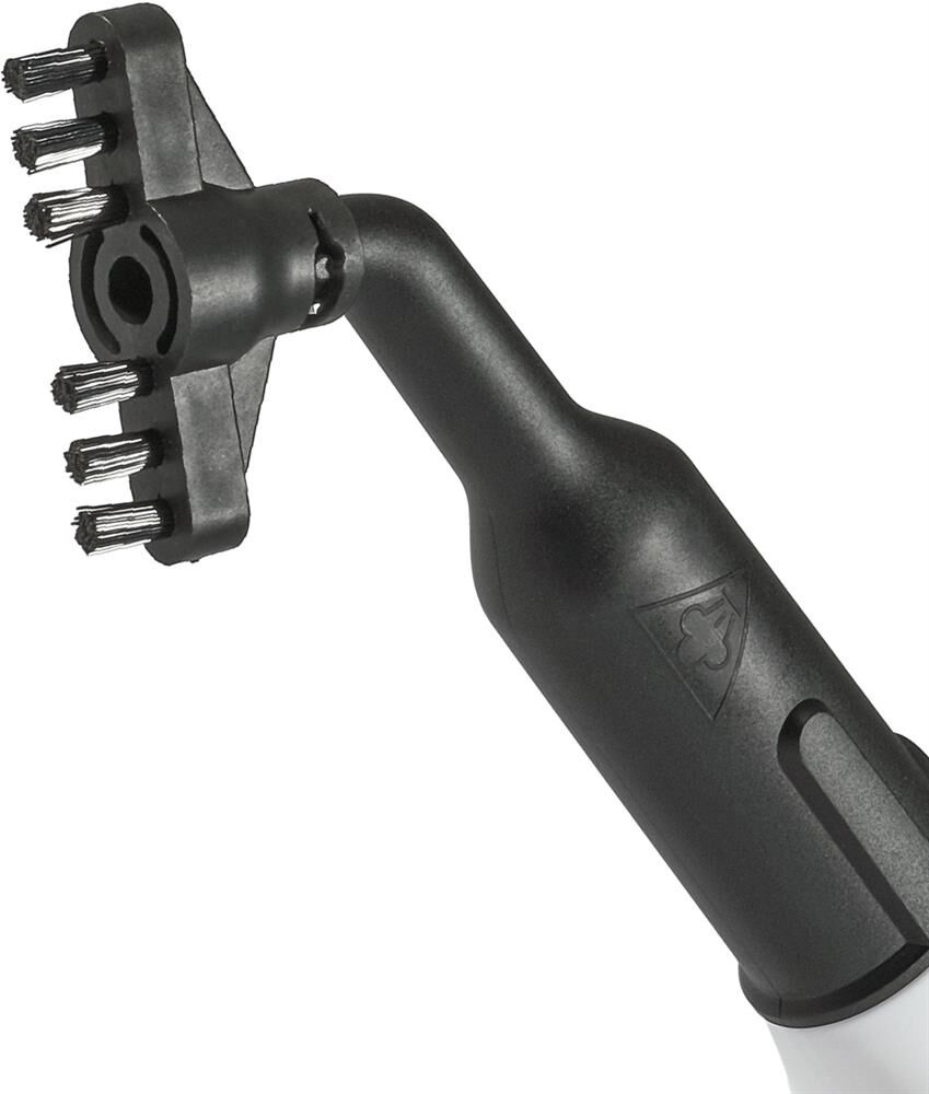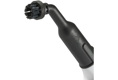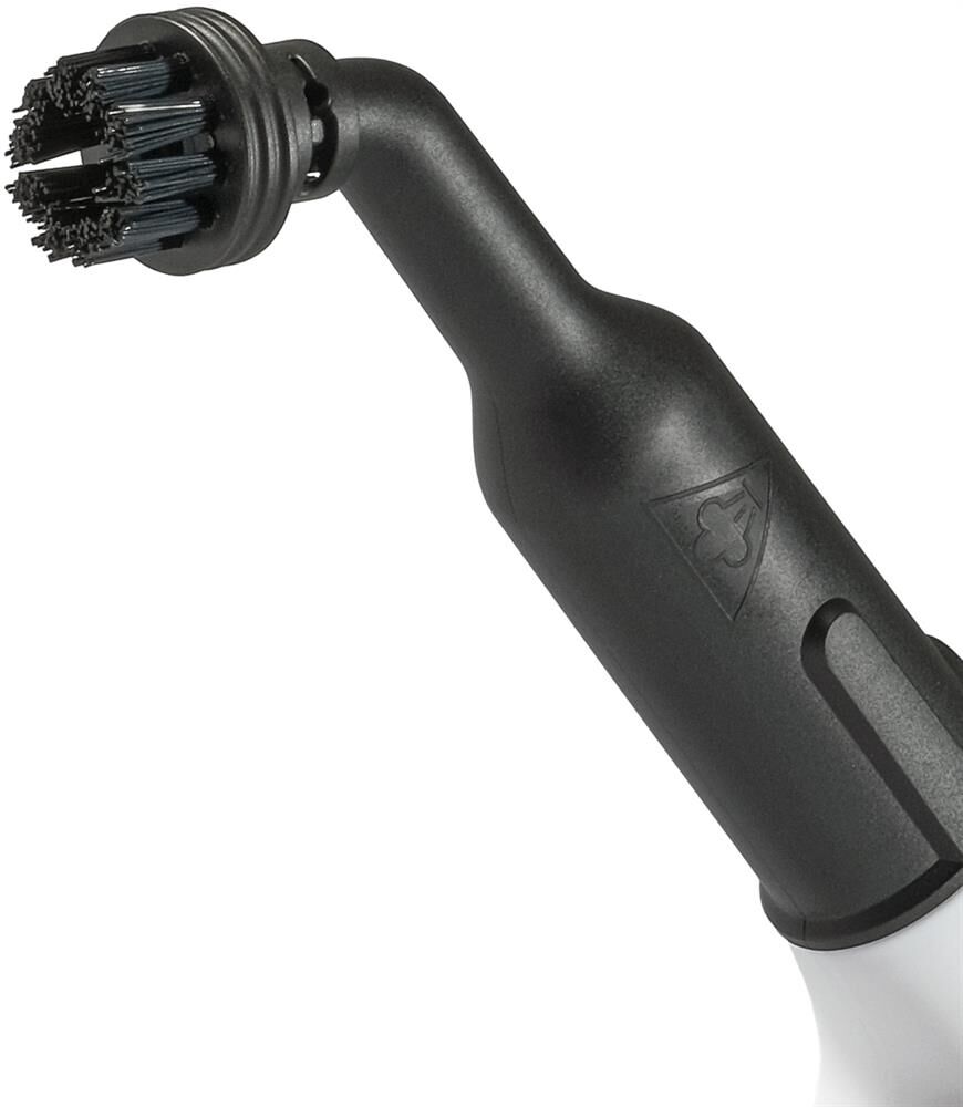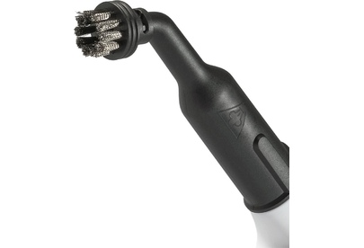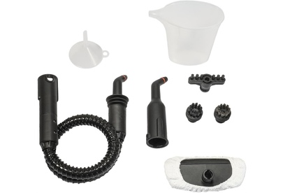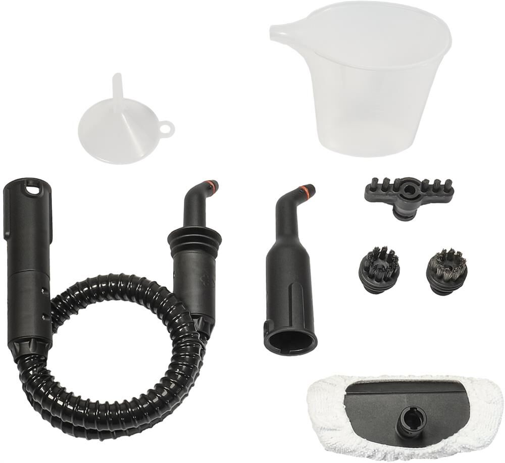 малая круглая щетка-насадка с полимерной щетиной, широкая щетка-насадка с полимерной щетиной, гибкий шланг для подачи пара, насадка для мытья окон/дверей, махровая салфетка