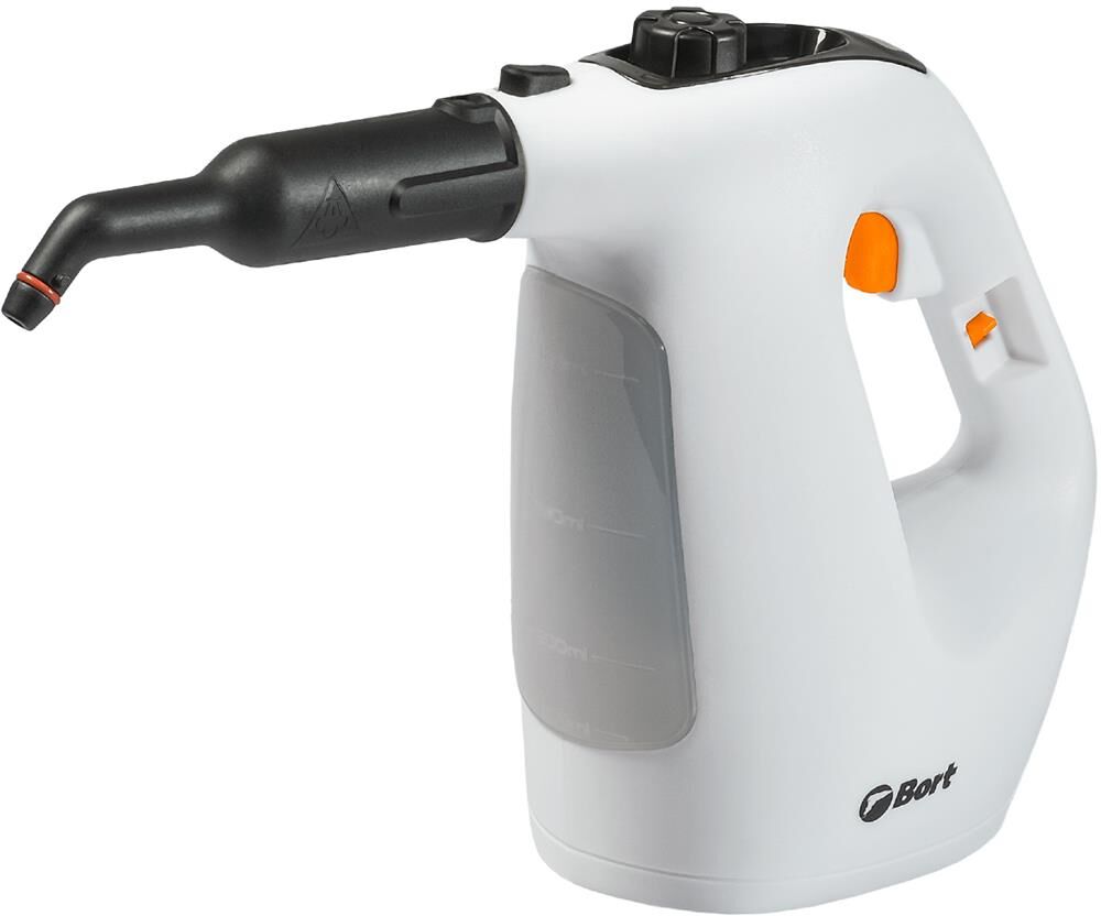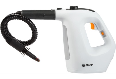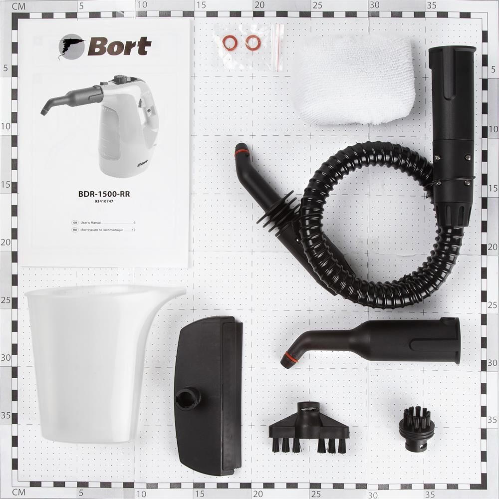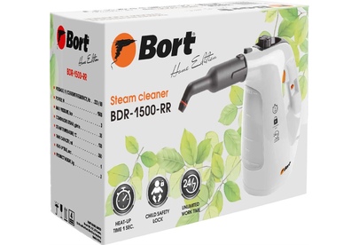 BORT BDR-1500-RR Ключевые характеристики: Brand: BORT. Мощность, Вт: 1 500 Макс давление, бар: 3. Постоянная подача пара, г/мин: 35. Температура пара, °С: 133. Емкость бачка, мл: 350. Время нагревания, с: 1. Время непрерывной работы, мин: 1 000. Регулировка мощности пара: Нет. Длина шланга, м: 0,55. Длина шнура питания, м: 2,7. Размер, мм: 300x125x245