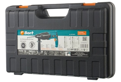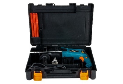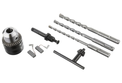боковая рукоятка, ограничитель глубины сверления, ключевой патрон, набор буров, запасные щетки, кейс