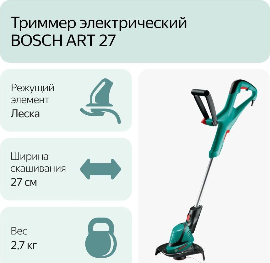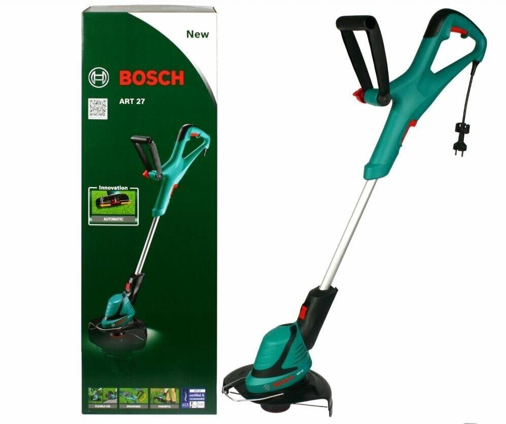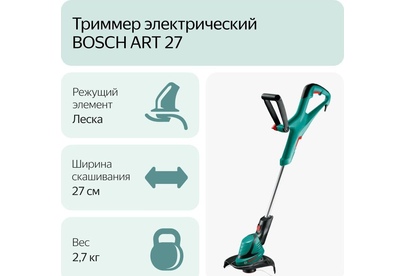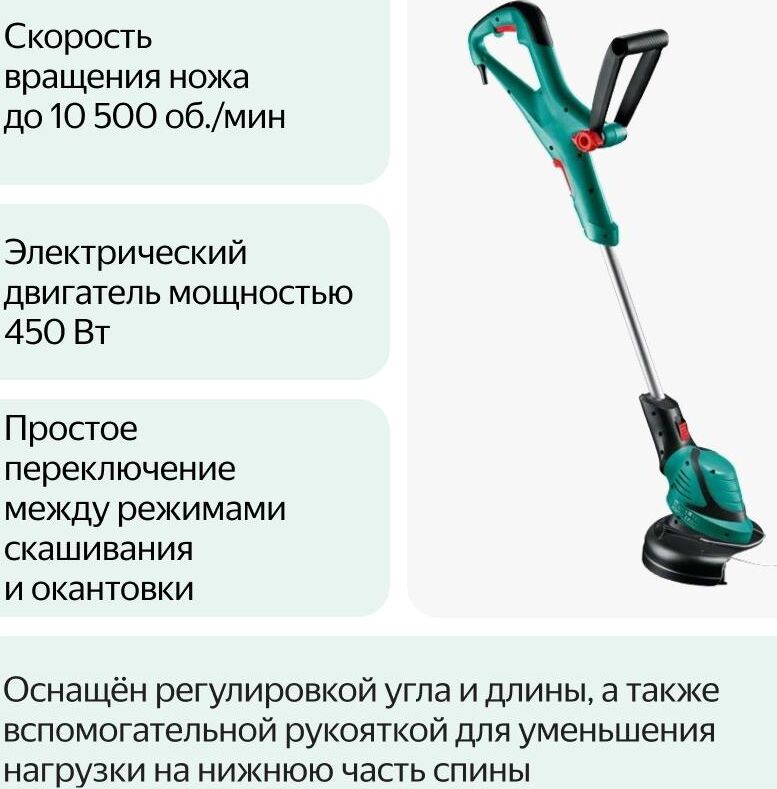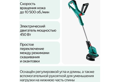 Мощность двигателя 450 W. Режущая система с леской Полуавтоматический. Диаметр круга стрижки (леска) 27 см. Регулировка длины штанги 80 – 115 см. Скорость резки 10.500 об/мин. Шпулька 1,6 мм x 6 м. Размеры инструмента (Д x Ш x В) 817 x 273 x 154 мм. Вес 2,7 кг.