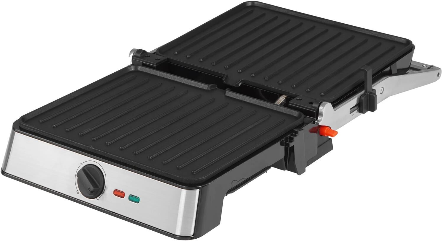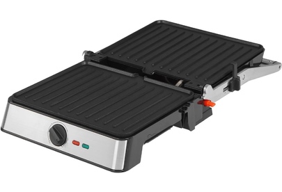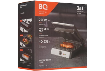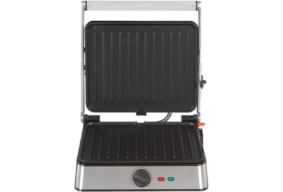 3 в 1: гриль, духовка, барбекю; мощность: 2200 Вт, тип управления: механическое, нагревательный элемент: нержавеющая сталь, регулировка температуры каждой панели, диапазон температур нагрева: 40-235 °С, материал корпуса: металл, бакелит, материал панелей: металл, антипригарное Non-Stick PRO, размер рабочей поверхности: 290 x 240 мм, количество панелей: 2, регулировка высоты, максимальный угол открытия крышки: 180°, индикатор нагрева. индикатор питания, съемный поддон для сбора масла/жира, длина шнура: 0.7 м, напряжение: 220-240 В, 50-60 Гц, защита от поражения электротоком: класс I