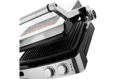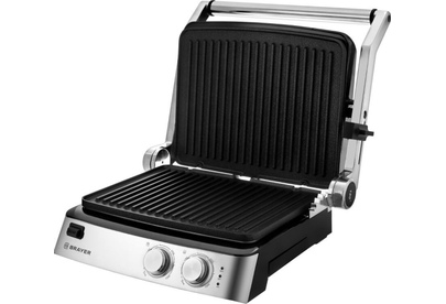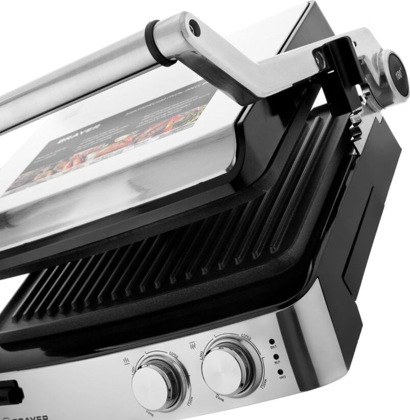 антипригарное покрытие, регулировка высоты верхней панели, поддон для сбора жира, съемные пластины