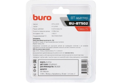 Бренд BURO Модель BU-BT502 Подключение USB Интерфейс USB USB2.0 Чипсет RTL8761B Стандарт Bluetooth Bluetooth 5.0+EDR Класс Bluetooth class 1.5 Скорость передачи данных 3 Мбит/с Радиус действия 20 м Поддерживаемые ОС Win7/Win8/Win10 Поставка Ret Цвет черный