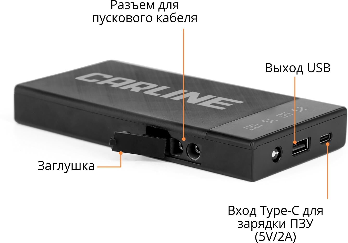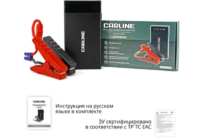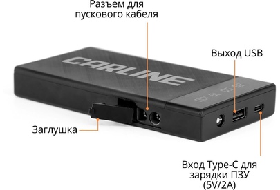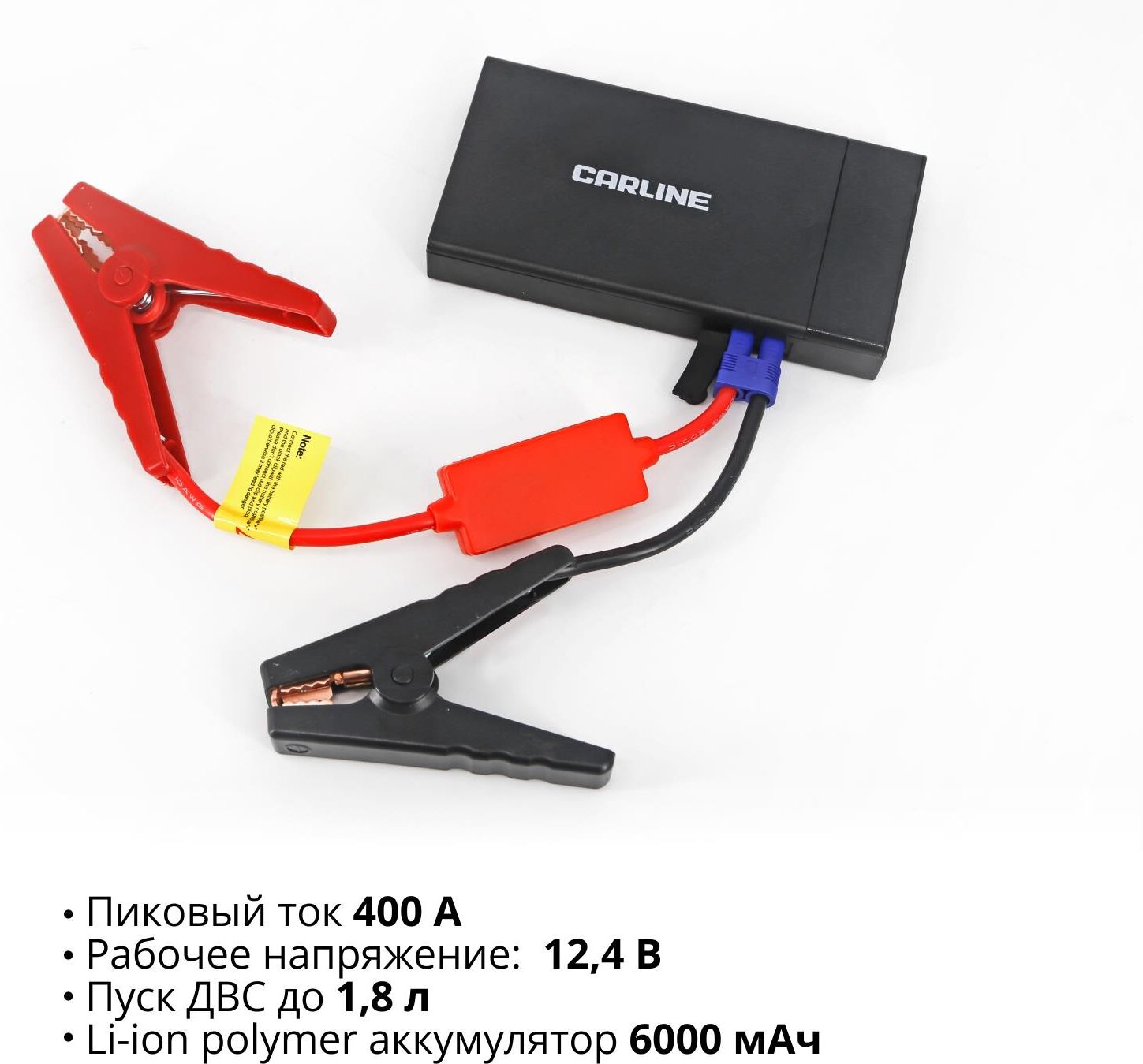 Усиленные медные зажимы «крокодил» • Многоуровневая защита от короткого замыкания и переполюсовки • Li-ion polimer аккумулятор класса +AAA • Цифровая индикация уровня заряда • Входной заряд через разъем Tipe-C • Функция PowerBank через разъем USB • Пусковое зарядное устройство • Стартовые провода с зажимами и блоком защиты • Кабель 3-в-1 (USB – microUSB/Type-c/Lightning) • Инструкция по эксплуатации • Гарантийный талон • Входные параметры: Tipe-C - 5V/2A • Выходные параметры: USB - 5V/2.1A • Ёмкость встроенного аккумулятора: 6000 мАч • Пиковый ток: 400А • Пусковое напряжение: 12,4 V • Тип встроенного аккумулятора: Li-ion polimer • Встроенный фонарик • Бренд: CARLINE • Страна производства: Китай • Материал: ABS пластик/металл