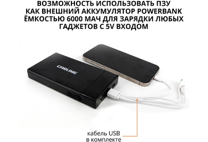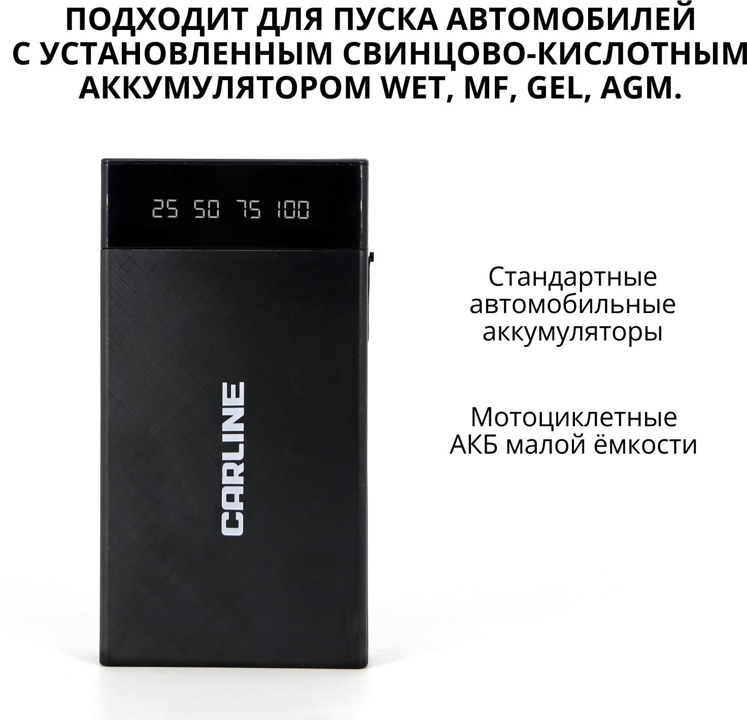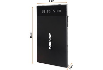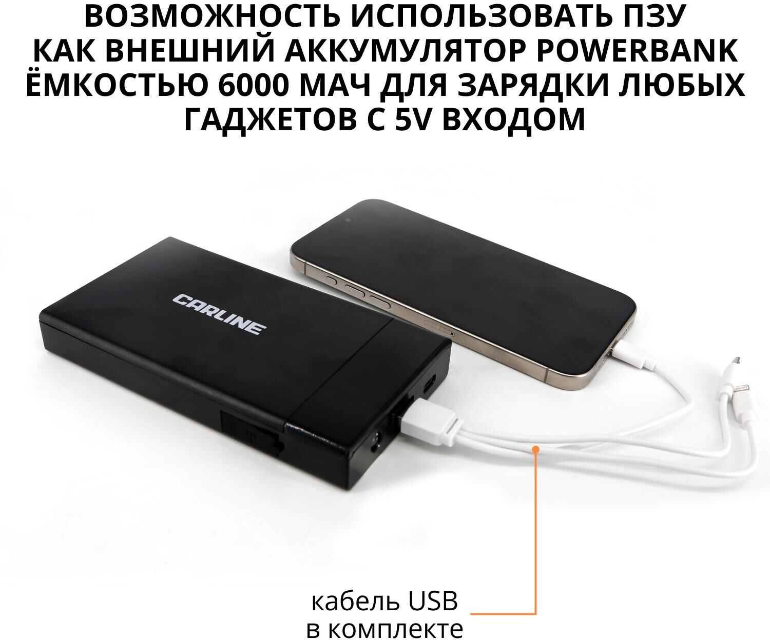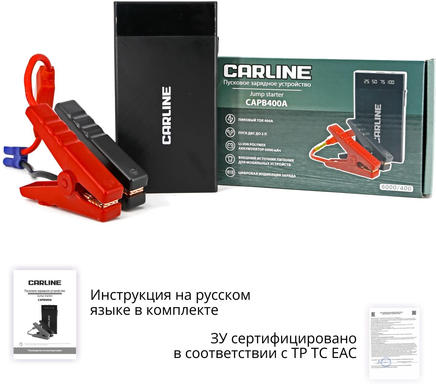 Усиленные медные зажимы «крокодил» • Многоуровневая защита от короткого замыкания и переполюсовки • Li-ion polimer аккумулятор класса +AAA • Цифровая индикация уровня заряда • Входной заряд через разъем Tipe-C • Функция PowerBank через разъем USB • Пусковое зарядное устройство • Стартовые провода с зажимами и блоком защиты • Кабель 3-в-1 (USB – microUSB/Type-c/Lightning) • Инструкция по эксплуатации • Гарантийный талон • Входные параметры: Tipe-C - 5V/2A • Выходные параметры: USB - 5V/2.1A • Ёмкость встроенного аккумулятора: 6000 мАч • Пиковый ток: 400А • Пусковое напряжение: 12,4 V • Тип встроенного аккумулятора: Li-ion polimer • Встроенный фонарик • Бренд: CARLINE • Страна производства: Китай • Материал: ABS пластик/металл