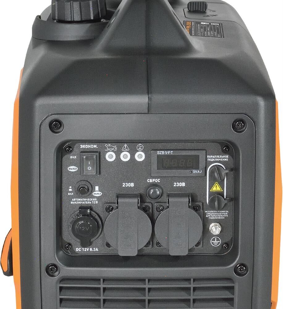Тип генератора: однофазный. Тип преобразователя сети: инвертор. Вольтметр: есть. Защита от перегрузки выходной сети: есть. Модель двигателя: H120i. Количество цилиндров: 1. Объем топливного бака: 6. Датчик уровня топлива: есть. Расход топлива: 1.9. Объем масляного картера: 0.4. Защита по уровню масла: есть. Ручной старт: есть. Счетчик моточасов: есть. Уровень шума: 67. Вес товара: 20.5. Особенности: Режим экономии топлива. Возможность параллельного включения двух устройств.. Комплектация: Генератор в сборе, вилка 16х2 - 2 шт., ключ свечной, отвертка, руководство по эксплуатации, упаковка. . Тип кожуха: Закрытый. Тип топлива: АИ-92. Габариты упаковки (ед) ДхШхВ: 0.575x0.37x0.56. Вес упаковки (ед): 42. Страна производства: Китай. Аккумулятор в комплекте: нет. Время непрерывной работы: 4. Дисплей: есть. Ручки для переноса: есть. Свеча зажигания: F7TC. Выход 12В: ДА. Глушитель: ДА. Тип охлаждения: воздушное. Гарантия: 12 мес.. Максимальная мощность: 2.8 кВт при 220 В. Номинальная мощность: 2.5 кВт при 220 В. Выхо