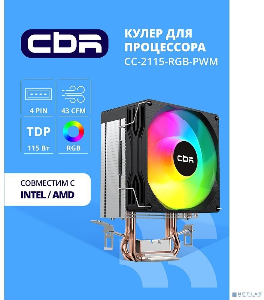 [Охлаждающие системы CBR] CBR-CC-2115-RGB-PWM Кулер для процессора, Al+Cu, 2 heat pipes, Socket 775/1155/1156/1150/1151/1200/1700/940/AM2/АМ2+/АМ3/AM3+/FM1/FM2/AM4/AM5, TDP 115W, 90mm Fan, 2600RPM, HB, RGB, PWM, 32db