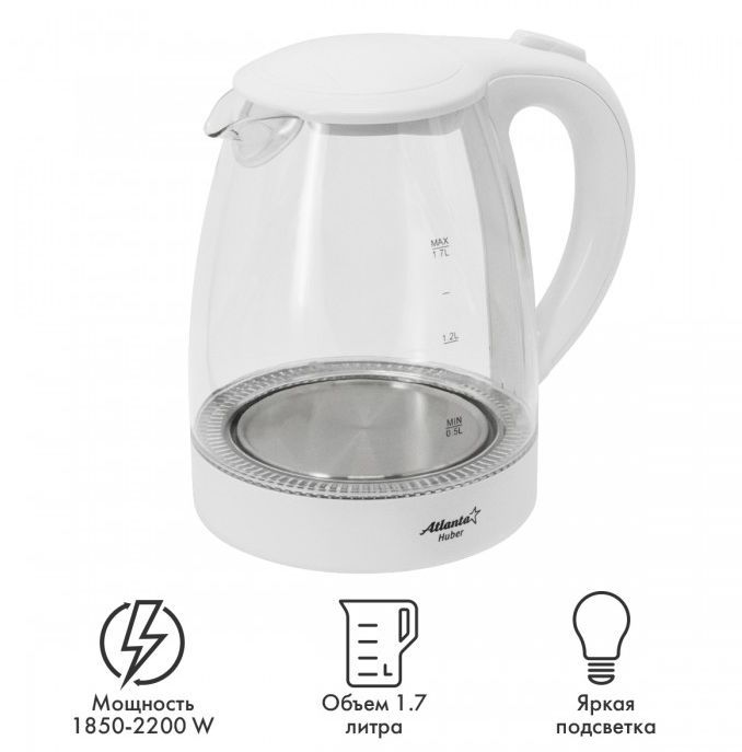ATLANTA ATH-2470 (WHITE) Корпус из термостойкого стекла Объем 1,7 литра Иллюминация Специальная ручка от скольжения Поворот на подставке на 360° Быстрое закипание Фильтр от накипи Закрытый нагревательный элемент Автоматическое отключение Защита от перегрева без воды Электрошнур в цокольной подставке, 70см Номинальная мощность 1850-2200 Вт 220-240 B ~ 50/60 Гц