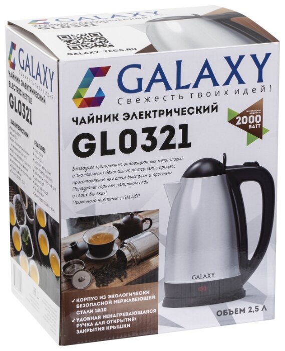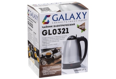 GALAXY GL 0321 Мощность 2000 Вт. Объем 2,5 л.Скрытый нагревательный элемент из нержавеющей стали марки 18/10 Корпус из нержавеющей стали марки 18/10Автоотключение при закипании Автоотключение при отсутствии воды Индикатор работы Параметры питания 220-240/50 В/Гц