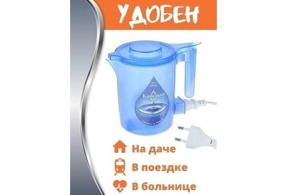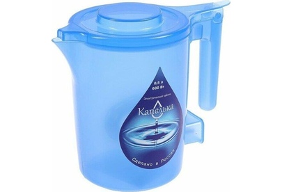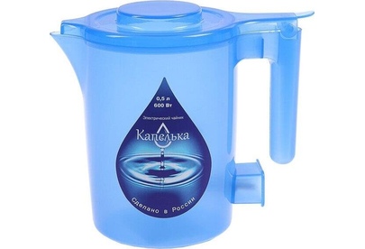Объем 0.5 л, мощность 600 Вт, нагревательный элемент – открытая спираль, длинна шнура - 0,7 м. материал корпуса: пластик.