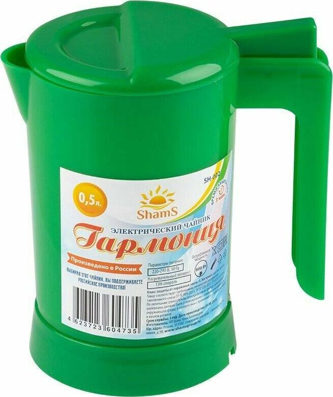 объем 0.5 л, мощность 800 Вт, нагревательный элемент – открытая спираль, длинна шнура - 0,7м материал корпуса: пластик Производство - Россия зеленый