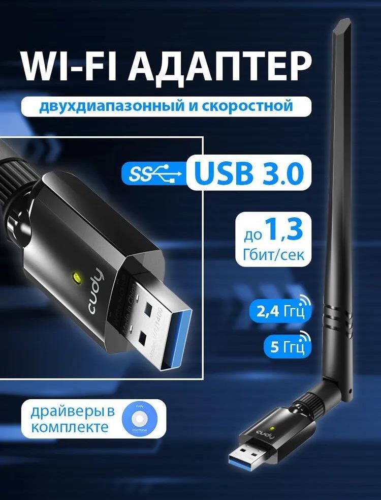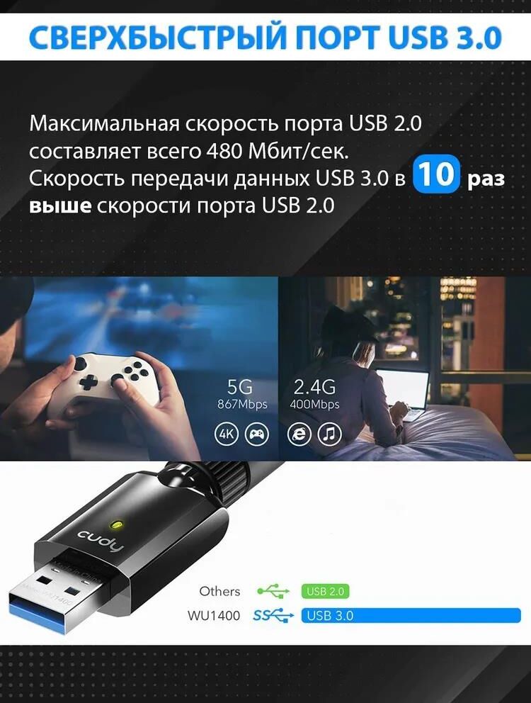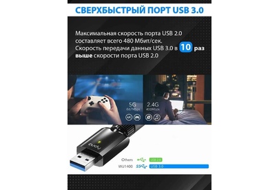 Wi-Fi USB 3.0 Адаптер AC1300, 1300 Мбит/с с высоким коэффициентом усиления, 802.11ac/a/b/g/n, 867 Мбит/с на 5 ГГц + 400 Мбит/с на 2,4 ГГц, 1 съемная антенна с высоким коэффициентом усиления, USB 3.0
