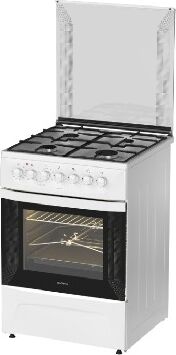 (ШхГхВ)60х60х85см. Комбинированная. 4 газ. горелки стола, электр. духовка 50л, интегрированный розжиг горелок стола, ТЭН-гриль, терморегулятор, 5-позиционный переключатель режимов жароч. шкафа, электрич. вертел, таймер механич., освещение, Стекл.крышка.