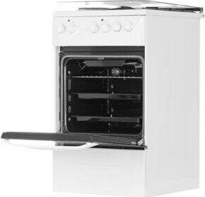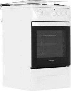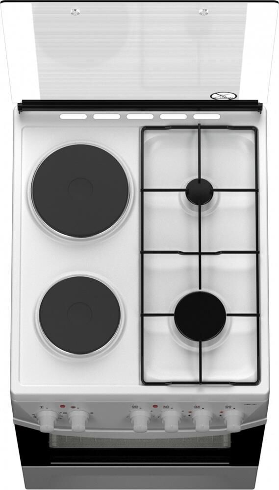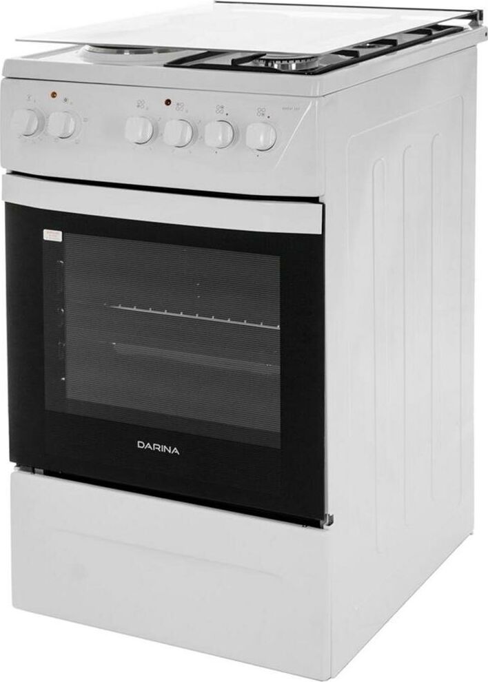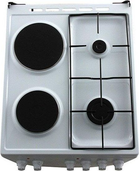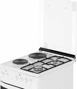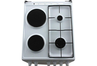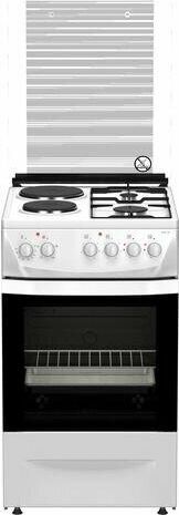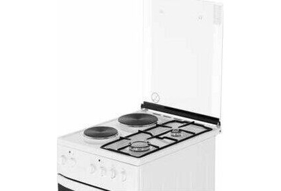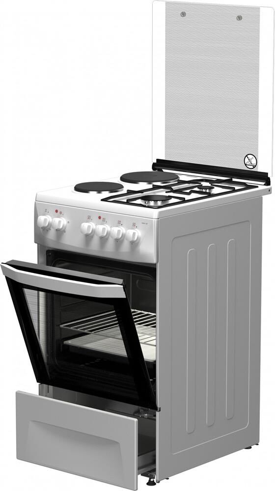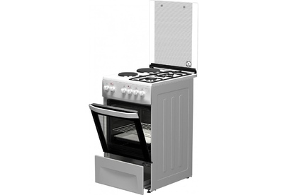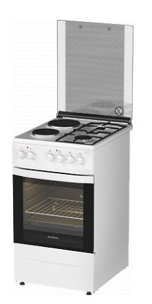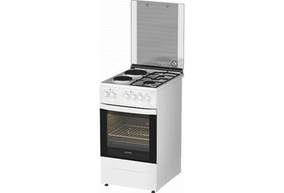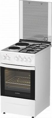 (ШхГхВ)50х60х85см. Цвет белый.Объем духовки, л.50.Количество конфорок 4. Газовые горелки стола 2.Электроконфорки (1кВт) 2.Электрическая духовка. Количество режимов духовки 4.Интегрированный электрический розжиг горелок стола.Терморегулятор.Подсветка.Выдвижной ящик.Регулируемые опоры. Крышка стеклянная.