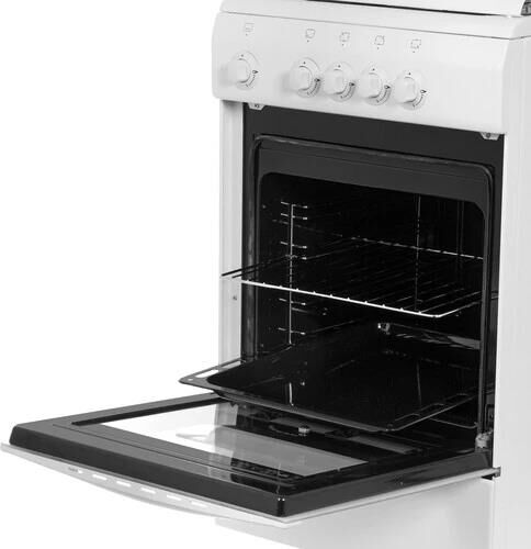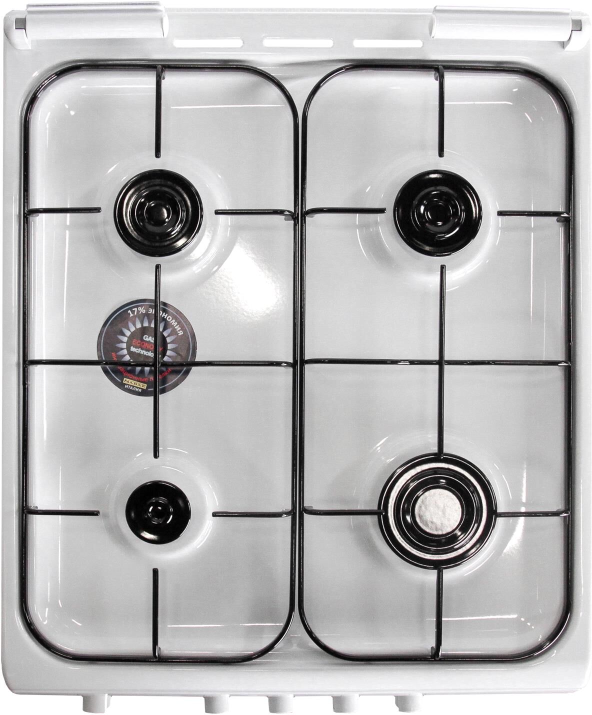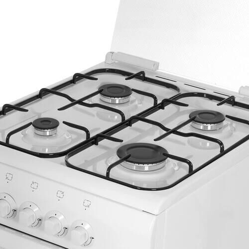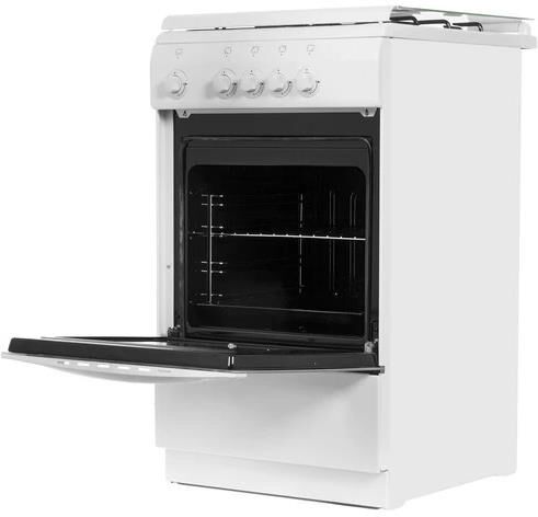 Габариты 850*500*600 Вес, кг – 35 Объём духовки 54 л. Основные характеристики варочной поверхности: 4 газовые конфорки 1,0/1,7/1,7/3,0 кВт Основные характеристики духового шкафа: Газ-контроль Комплектация: Большой противень Малый противень Решётка для жарки Эмалированная решётка Стеклянная крышка рабочего стола Хозяйственный отсек Техническое описание: Цвет - белый