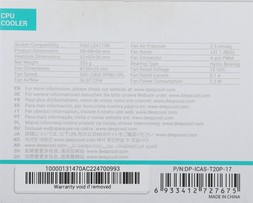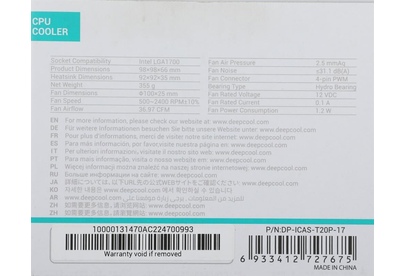 Количество вентиляторов: 1. Размер вентилятора: 100. Материал радиатора: алюминий. Тип поставки: Ret. Высота кулера: 66. Вес: 355. Ширина кулера: 98. Длина кулера: 98. Макс, рассеиваемая мощность (TDP, Вт): 95. Направление выдува: перпендикулярно МП. Материал основания прилегающего к охлаждаемому устройству: алюминий. Питание вентилятора от материнской платы: 4-pin. Потребляемое напряжение вентилятора: 12. Потребляемая мощность вентилятора: 1.2. Габариты упаковки (ед) ДхШхВ: 0.103x0.103x0.085. Вес упаковки (ед): 0.4. Цвет: черный. Гарантия: 12 мес.. Скорость вращения вентилятора: 500 - 2400 об/мин. Тип подшипника: Hydro Bearing. Тепловые трубки: без тепловых трубок. Воздушный поток вентилятора: 36.97 cfm. Уровень шума вентилятора: 31.1 дБ. Особенности системы охлаждения: PWM. Назначение кулера для бренда: Intel. Socket: LGA 1700, LGA 1851. Тип крепления: на винтах. Дополнительные особенности: цельное основание. Вентиляторы: 1шт, 100 мм, 500 - 2400 об/мин; 31.1 дБ. Радиатор: алюминий. Макс, рассеиваемая мощнос
