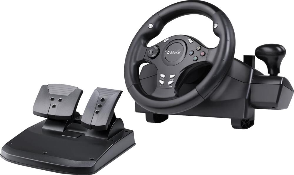 Проводной игровой руль с эффектом вибрации, удобными педалями и рычагом переключения передач. Поддерживаемые платформы: PlayStation® 3, PlayStation® 4, Android 5.0 и выше, Android TV box, XBOX 360, Nintendo Switch, XBOX One, Xbox Series X/S , ПК (Dinput и Xinput). Руль надежно крепится к столешнице при помощи струбцин.