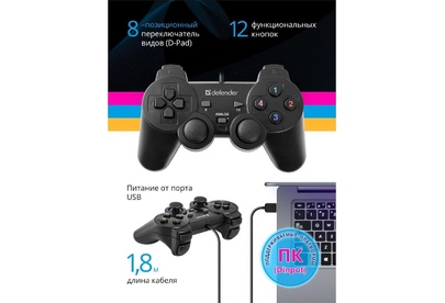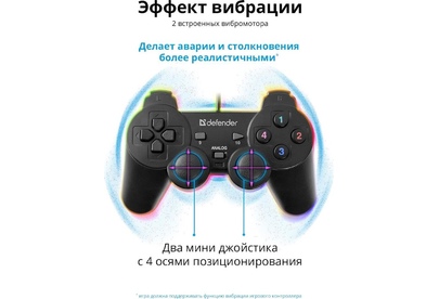 Проводной геймпад, 12 функциональных кнопок, 2 аналоговых джойстика, 2 мини джойстика позволяют играть в дополнительные игры, например, в футбольные симуляторы, 8-позиционный переключатель видов, эффект вибрации - делает аварии и столкновения более реали