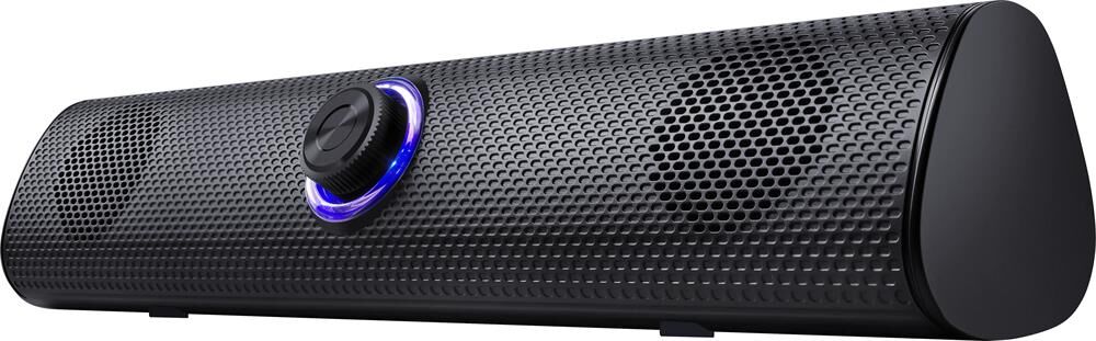 Компактный саундбар с нескользящими ножками под монитор вашего ПК. Регулятор громкости с приятной подсветкой удобно расположен на передней панели.
