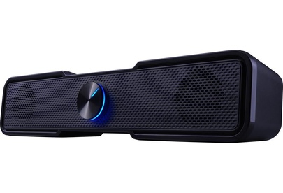 Компактный саундбар с нескользящими ножками под монитор вашего ПК. Регулятор громкости с приятной подсветкой удобно расположен на передней панели.