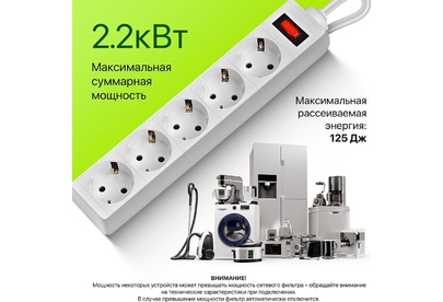 Номинальное напряжение: 220 В/ 50 Гц. Максимальный ток нагрузки: 10 A. Максимальная рассеиваемая энергия: 90 Дж. Суммарная мощность нагрузки: 2200 Вт. Количество розеток: 5 розеток с заземлением