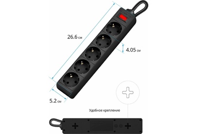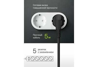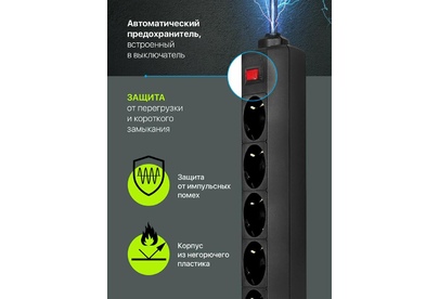 Номинальное напряжение: 220 В/ 50 Гц. Максимальный ток нагрузки: 10 A. Максимальная рассеиваемая энергия: 90 Дж. Суммарная мощность нагрузки: 2200 Вт. Количество розеток: 5 розеток с заземлением