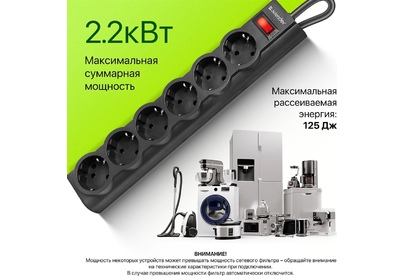 Сетевой фильтр, номинальное напряжение: 220 В/ 50-60 Гц, мощность нагрузки 2200 Вт, максимальный ток нагрузки 10А, защита от перегрузок и короткого замыкания, на «борту» имеет 6 розеток евростандарт, длина шнура 1,8 м.