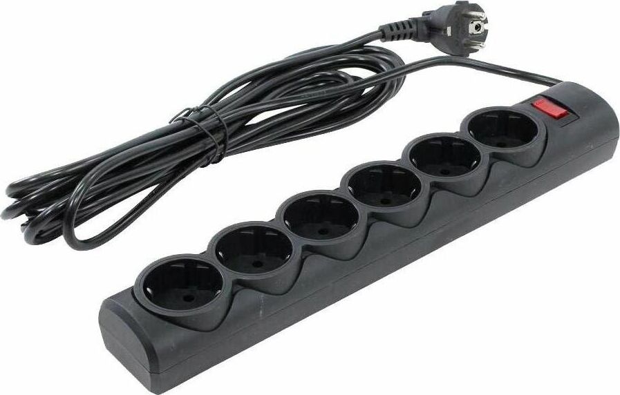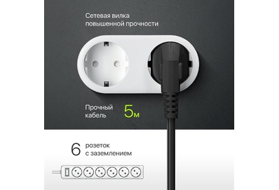 Сетевой фильтр, номинальное напряжение: 220 В/ 50-60 Гц, мощность нагрузки 2200 Вт, максимальный ток нагрузки 10А, защита от перегрузок и короткого замыкания, на «борту» имеет 6 розеток евростандарт, длина шнура 5 м.