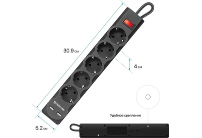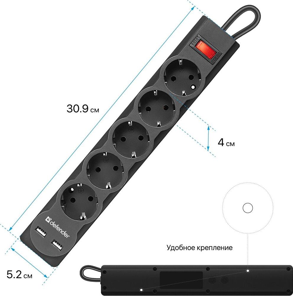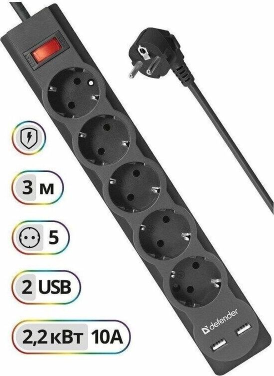 Максимальная рассеиваемая энергия: 220 Дж, Защищаемые цепи: фаза-ноль, Защита от перегрузки и короткого замыкания: автоматический несгораемый предохранитель, встроенный в выключатель, Кол-во розеток: 5 шт.,Розетки с заземлением: 5 шт., Номинальное напряжение/частота: 230 В / 50 Гц, Максимальная суммарная мощность нагрузки: 2200 Вт, Максимальный ток нагрузки: 10 А, Длина: 3.0 м, Напряжение на USB-портах: 5 В, Кол-во USB-портов для зарядки: 2 шт., Максимальный ток USB-порта: 2.1 А, Токовая защита USB-портов, USB-порт для зарядки устройств, Крепление на стену.