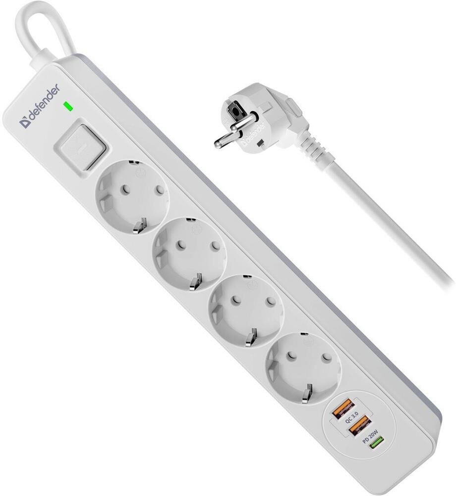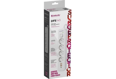 [Сетевые фильтры] Defender Удлинитель с сетевым фильтром DFS 143 3 м,белый,4розетки,USB+TypeC [99434]