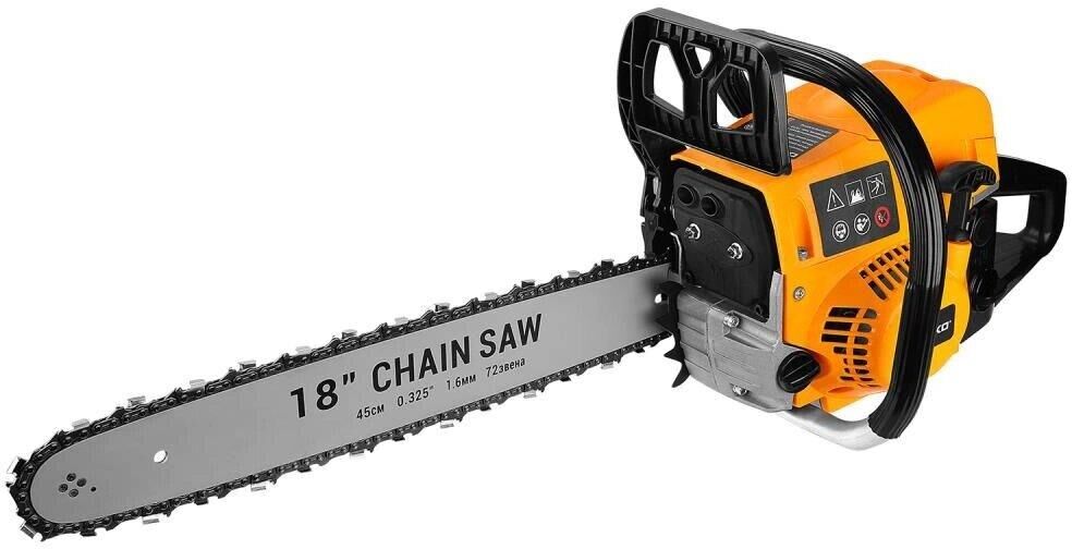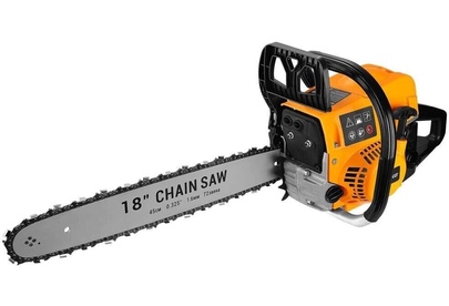 Тип: Бензопила. Длина пильной шины: 18" (45 см). Натяжение цепи: с использованием инструментов. Вес товара: 6.75. Топливный бак, объем: 0.55. Бак смазки цепи, объем: 0.26. Рабочий объем двигателя: 45. Мощность двигателя, л.с.: 3.1. Тип двигателя: бензиновый. Тип бензинового двигателя: 2-х тактный. Шаг цепи: 0.325. Ширина паза цепи: 1.6 мм. Комплектация: Емкость для топливной смеси - 1 шт, Комбинированный ключ - 1 шт, Шестигранный ключ - 1 шт, Отвертка - 1 шт, Винт - 2 шт, Руководство по эксплуатации - 1 шт. Максимальная частота вращения: 8500. Тип топлива: АИ-92+масло. Габариты упаковки (ед) ДхШхВ: 0.478x0.26x0.295. Вес упаковки (ед): 7.5. Страна производитель: Китай. Гарантия: 12 мес.. Двигатель: бензиновый, 2-х тактный, макс. 8500 об/мин, 3.1 л.с. Объем двигателя: 45 см3. Длина шины: 18" (45 см). Цепь: шаг 0.325, ширина паза 1.6 мм. Вес: 6.75 кг