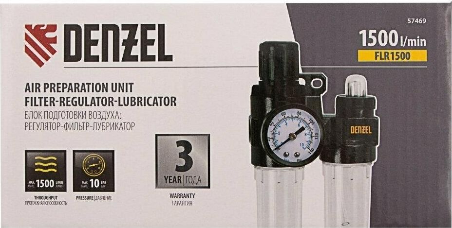 DENZEL Блок подготовки воздуха регулятор-фильтр-лубрикатор FLR1500, 10 бар, 1500 л/мин, 1/4 57469