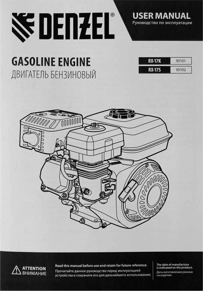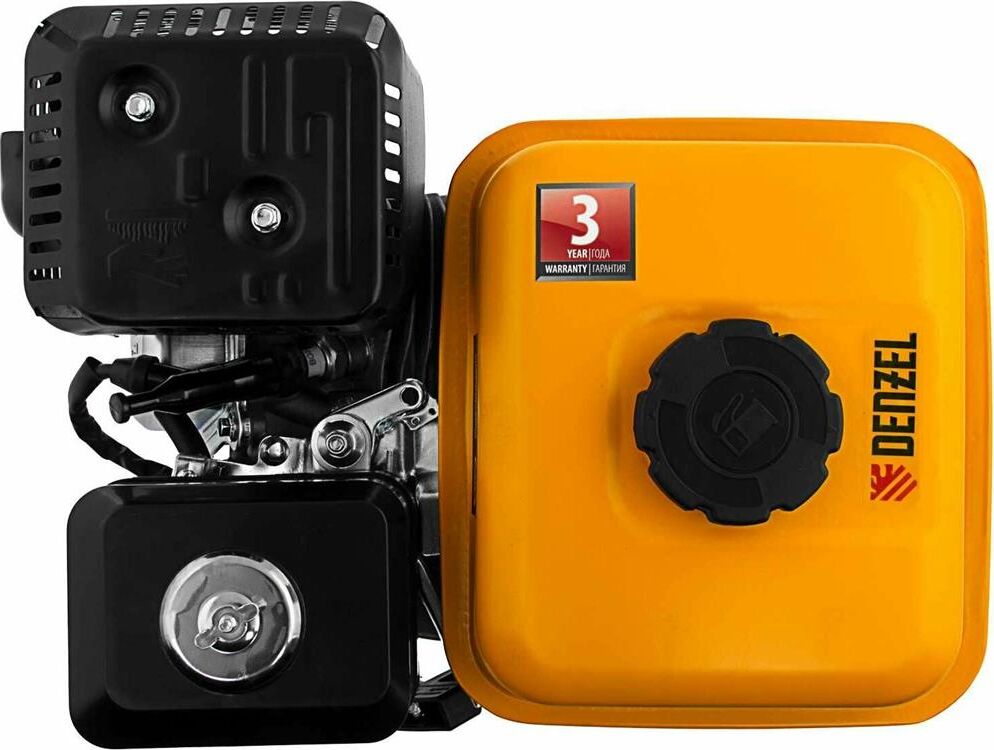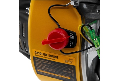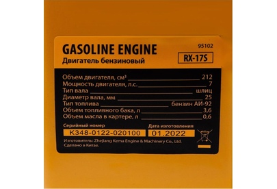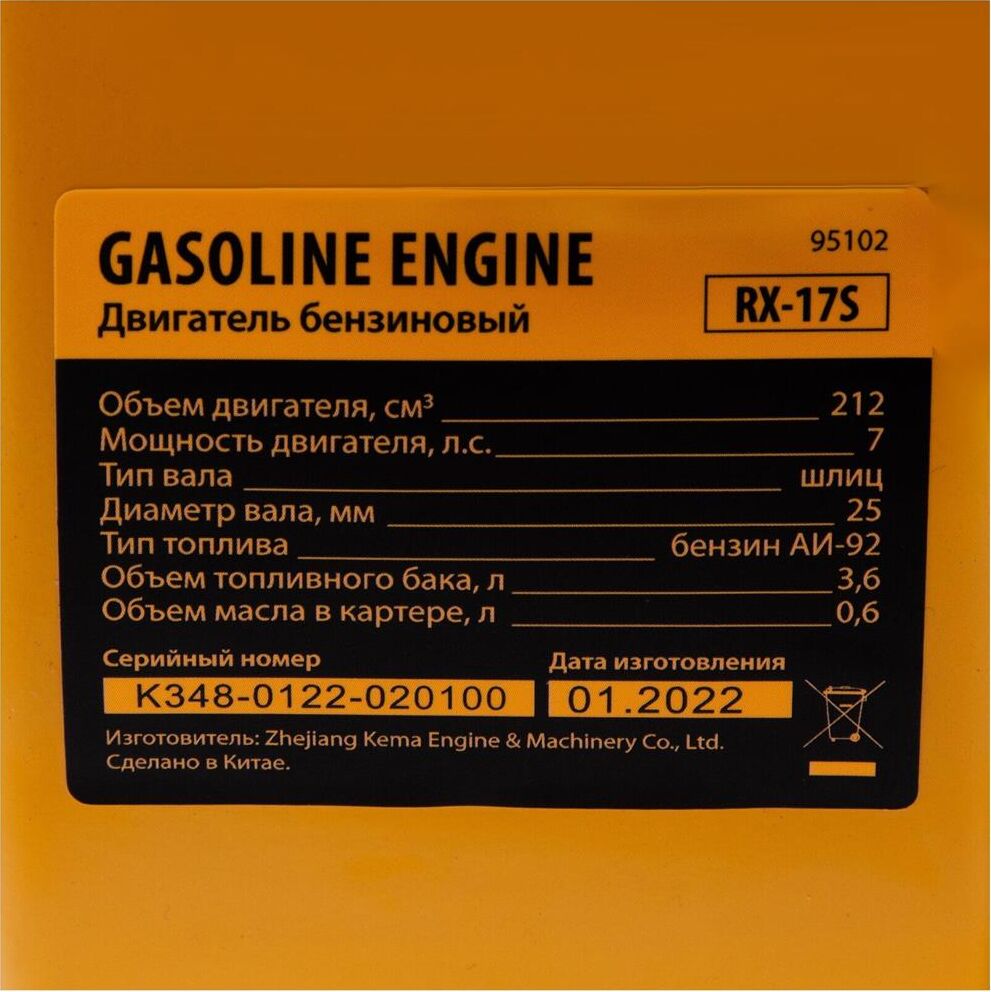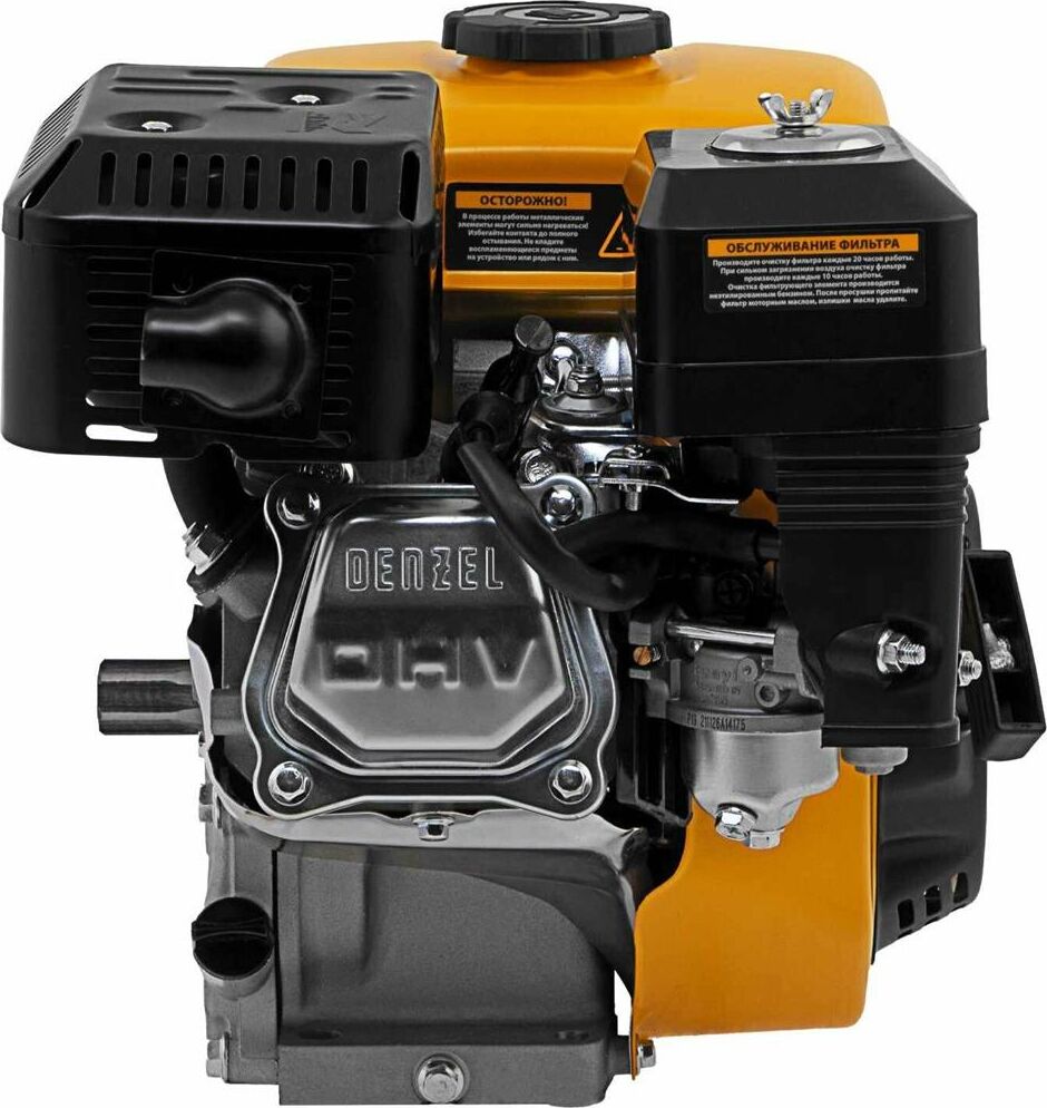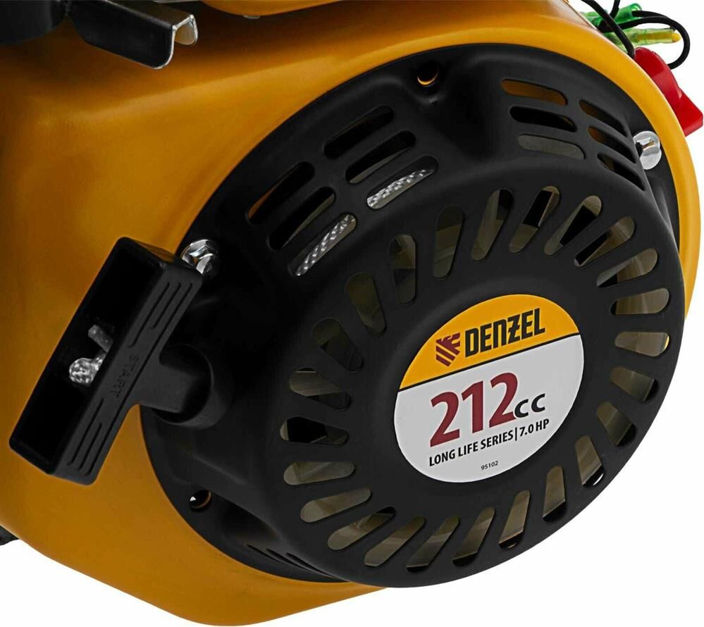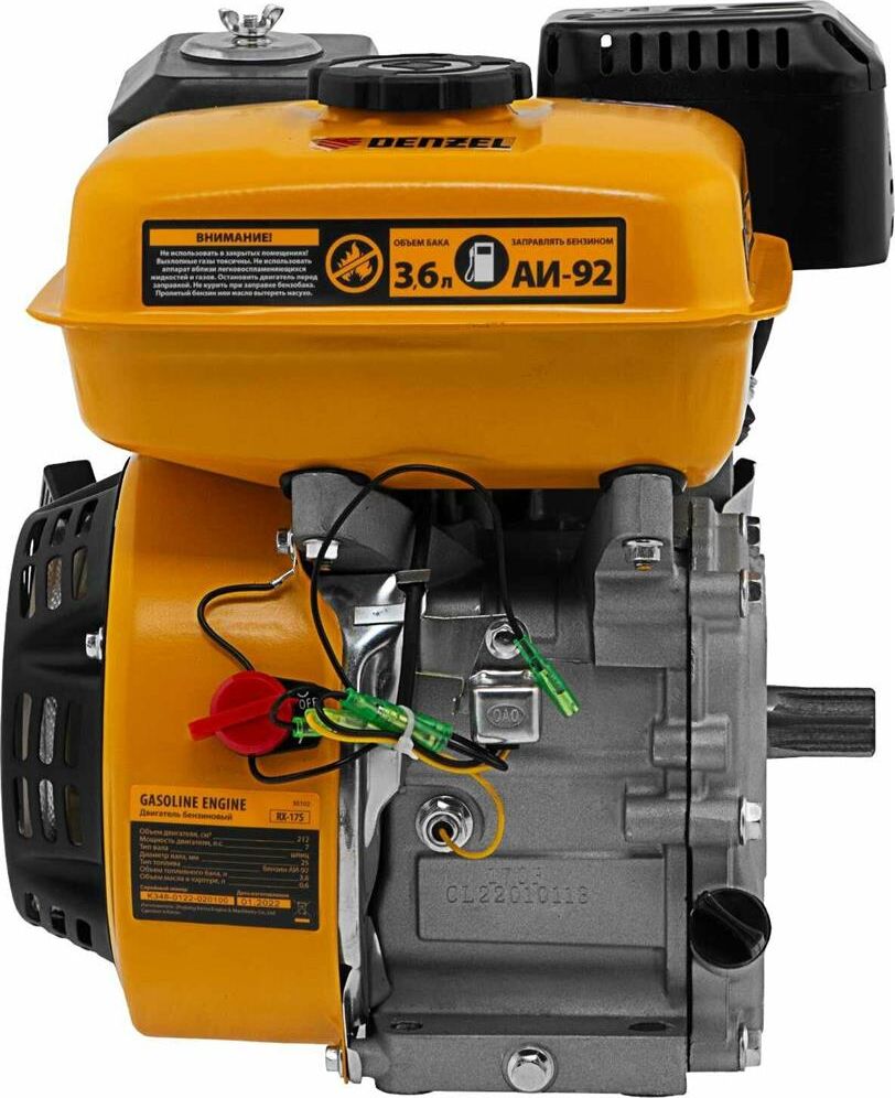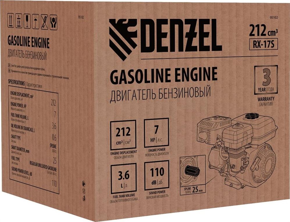 Четырехтактный бензиновый двигатель Denzel RX17S 95102 мощностью 7 л. с. и объемом 212 см3, с типом горизонтального вала шлиц 25 мм, имеет ручной старт и воздушное охлаждение. Устанавливается на бензотехнику: мотоблоки, садовые измельчители, мотопомпы, виброплиты, мойки высокого давления. Обеспечивает бесперебойное функционирование оборудования и эффективное выполнение сельскохозяйственных, строительных работ, а также решение прочих задач на загородном участке.ПреимуществаЭффективность — шлицевой выходной вал улучшает передачу крутящего момента.Экономичность — вместительный бак в сочетании с низким расходом топлива позволяет длительное время работать без дозаправки (до 3,5 часов).Надежная система запуска — усовершенствованное электронное зажигание обеспечивает уверенный и быстрый старт.Защита от поломки — при низком уровне масла двигатель не запустится.Высококачественные комплектующие — свеча зажигания Bosch, надежные узлы и детали обеспечивают длительную стабильную работу даже в условиях повышенных нагрузок.